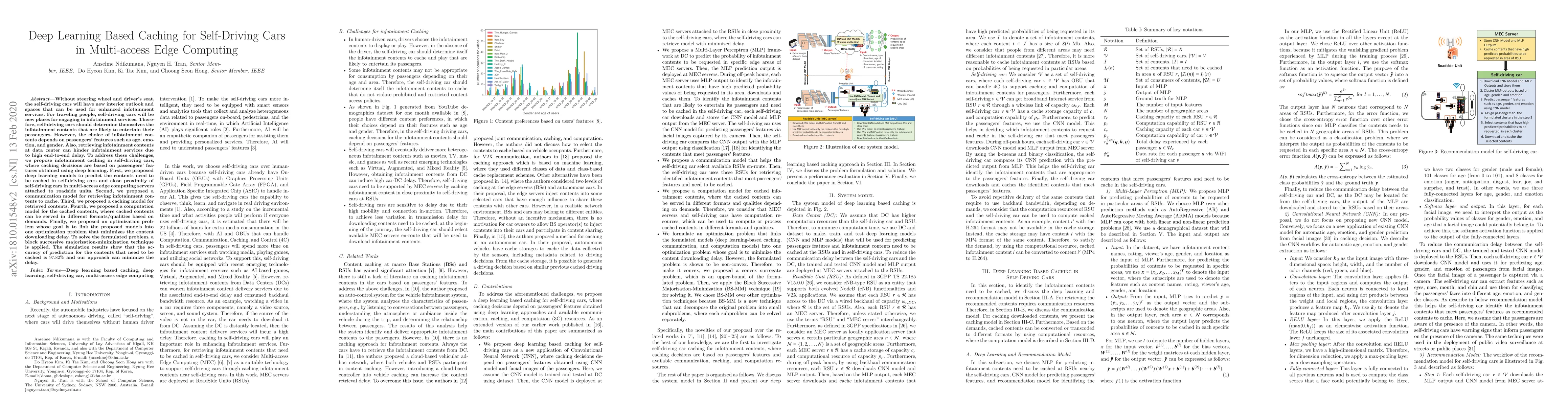 This paper proposes a deep learning-based caching system for self-driving cars to enhance entertainment services, utilizing Multi-access Edge Computing (MEC). It employs Deep Learning techniques to predict content requests and passenger features, aiming to minimize content delivery delay.