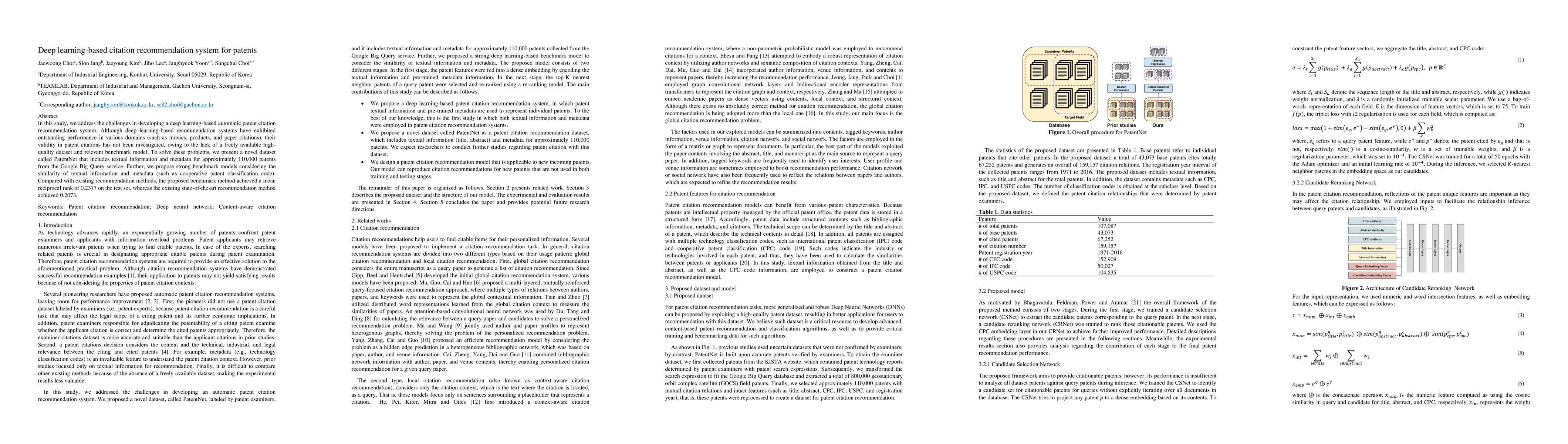 This study introduces a deep learning-based citation recommendation system for patents, addressing the lack of a high-quality dataset and benchmark model. The authors present PatentNet, a new dataset, and propose benchmark models that outperform existing methods, achieving a mean reciprocal rank of 0.2377.