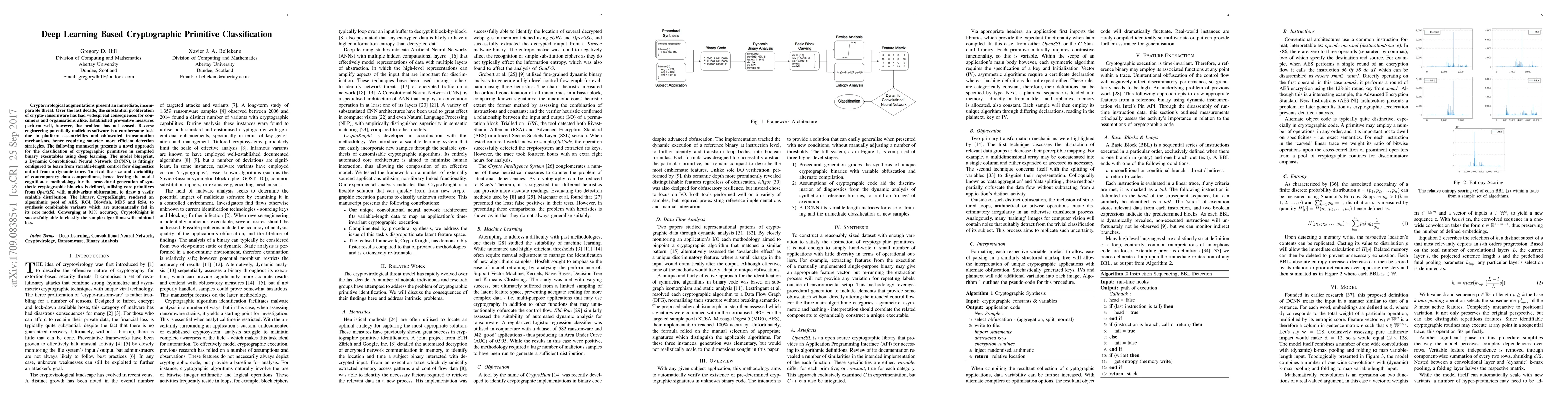 Cryptovirological augmentations present an immediate, incomparable threat. Over the last decade, the substantial proliferation of crypto-ransomware has had widespread consequences for consumers and organisations alike. Established preventive measures perform well, however, the problem has not ceased. Reverse engineering potentially malicious software is a cumbersome task due to platform eccentricities and obfuscated transmutation mechanisms, hence requiring smarter, more efficient detection strategies. The following manuscript presents a novel approach for the classification of cryptographic primitives in compiled binary executables using deep learning. The model blueprint, a DCNN, is fittingly configured to learn from variable-length control flow diagnostics output from a dynamic trace. To rival the size and variability of contemporary data compendiums, hence feeding the model cognition, a methodology for the procedural generation of synthetic cryptographic binaries is defined, utilising core primitives from OpenSSL with multivariate obfuscation, to draw a vastly scalable distribution. The library, CryptoKnight, rendered an algorithmic pool of AES, RC4, Blowfish, MD5 and RSA to synthesis combinable variants which are automatically fed in its core model. Converging at 91% accuracy, CryptoKnight is successfully able to classify the sample algorithms with minimal loss.