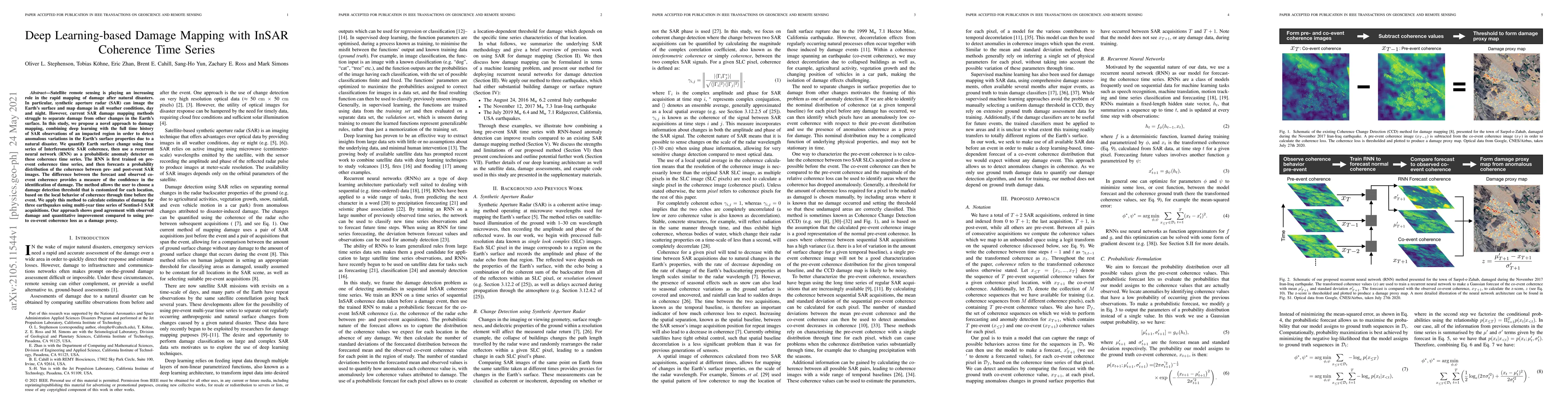 This paper proposes a deep learning-based method combining recurrent neural networks with Interferometric SAR coherence time series for improved damage mapping after natural disasters. The approach uses pre-event coherence data to train an RNN, which then detects anomalies in post-event coherence, providing a probabilistic measure of damage.