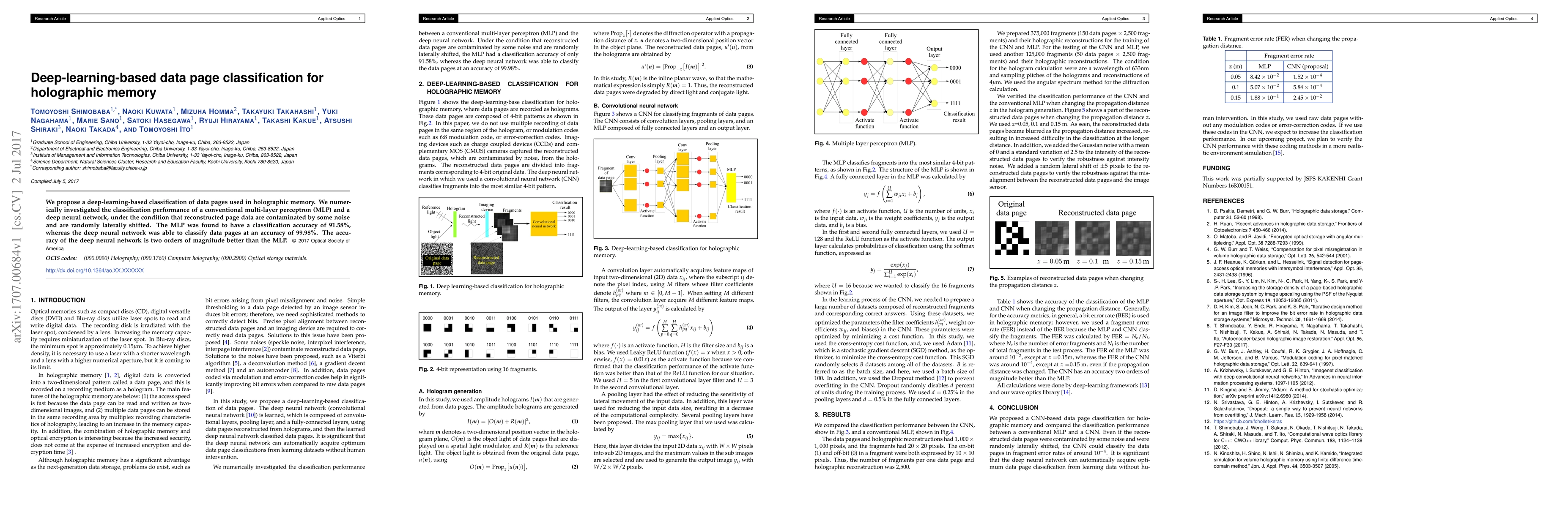 A deep-learning-based approach outperforms a conventional neural network in classifying holographic memory data pages with high accuracy. The deep learning model achieves 99.98% classification accuracy under noisy conditions.