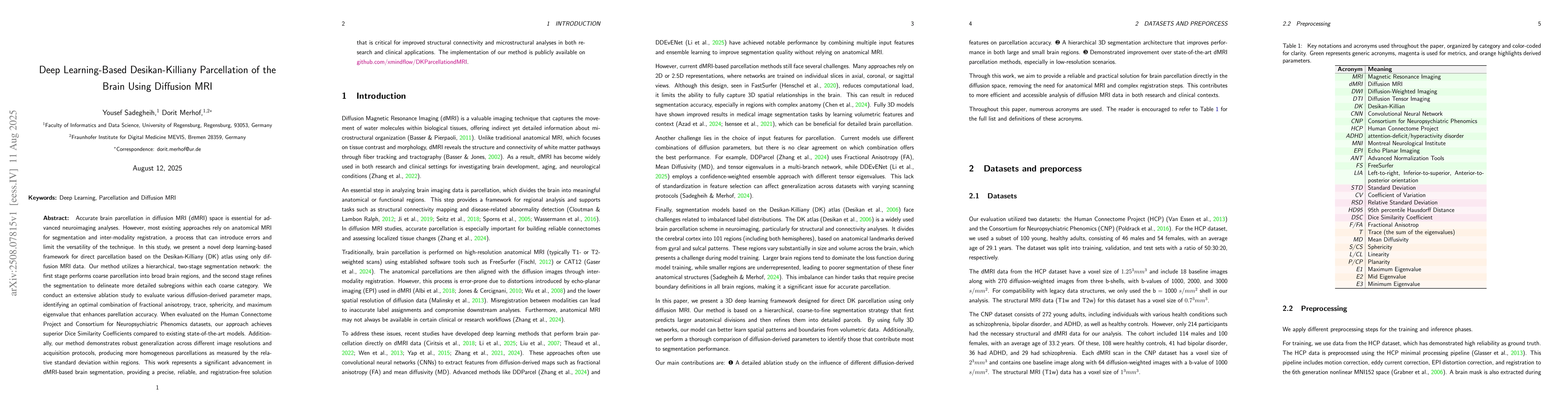 Accurate brain parcellation in diffusion MRI (dMRI) space is essential for advanced neuroimaging analyses. However, most existing approaches rely on anatomical MRI for segmentation and inter-modality registration, a process that can introduce errors and limit the versatility of the technique. In this study, we present a novel deep learning-based framework for direct parcellation based on the Desikan-Killiany (DK) atlas using only diffusion MRI data. Our method utilizes a hierarchical, two-stage segmentation network: the first stage performs coarse parcellation into broad brain regions, and the second stage refines the segmentation to delineate more detailed subregions within each coarse category. We conduct an extensive ablation study to evaluate various diffusion-derived parameter maps, identifying an optimal combination of fractional anisotropy, trace, sphericity, and maximum eigenvalue that enhances parellation accuracy. When evaluated on the Human Connectome Project and Consortium for Neuropsychiatric Phenomics datasets, our approach achieves superior Dice Similarity Coefficients compared to existing state-of-the-art models. Additionally, our method demonstrates robust generalization across different image resolutions and acquisition protocols, producing more homogeneous parcellations as measured by the relative standard deviation within regions. This work represents a significant advancement in dMRI-based brain segmentation, providing a precise, reliable, and registration-free solution that is critical for improved structural connectivity and microstructural analyses in both research and clinical applications. The implementation of our method is publicly available on github.com/xmindflow/DKParcellationdMRI.