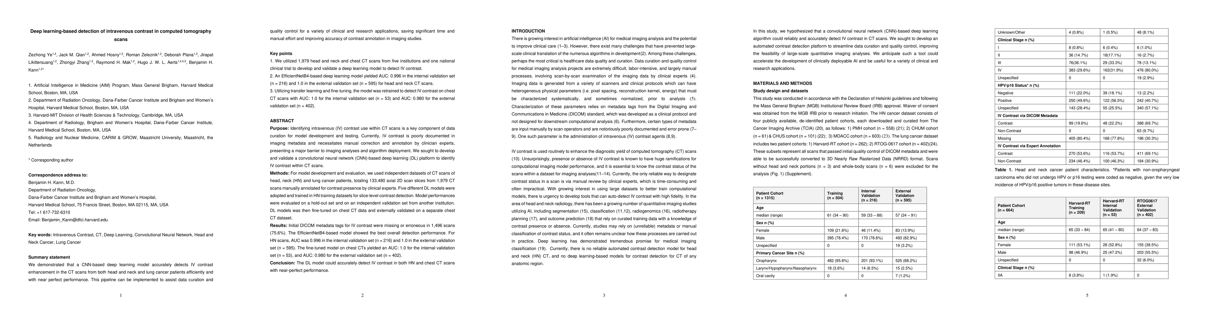 This study developed and validated a convolutional neural network (CNN)-based deep learning platform to detect intravenous contrast in CT scans, addressing the issue of poorly documented contrast in imaging metadata. The EfficientNetB4-based model demonstrated near-perfect performance in detecting contrast in head, neck, and chest CT scans.