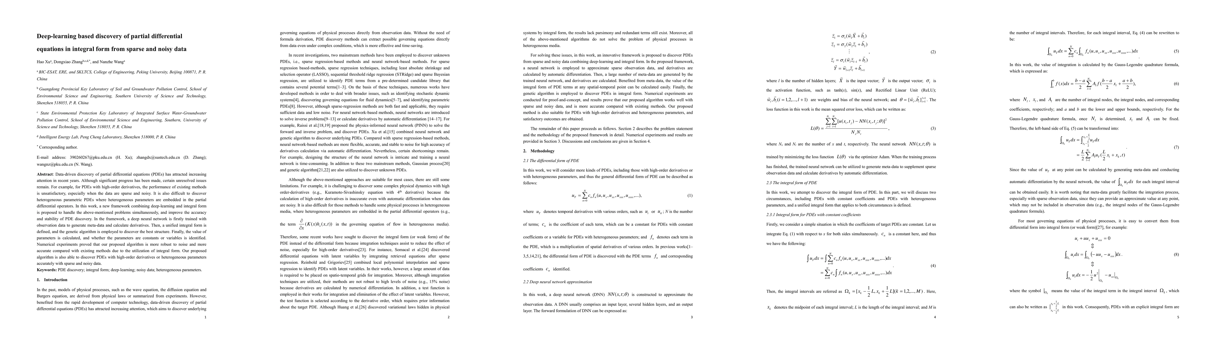 This paper proposes a new deep-learning framework for discovering partial differential equations (PDEs) in integral form from sparse and noisy data. The method combines deep neural networks and genetic algorithms to improve accuracy and robustness, especially for PDEs with high-order derivatives and heterogeneous parameters.