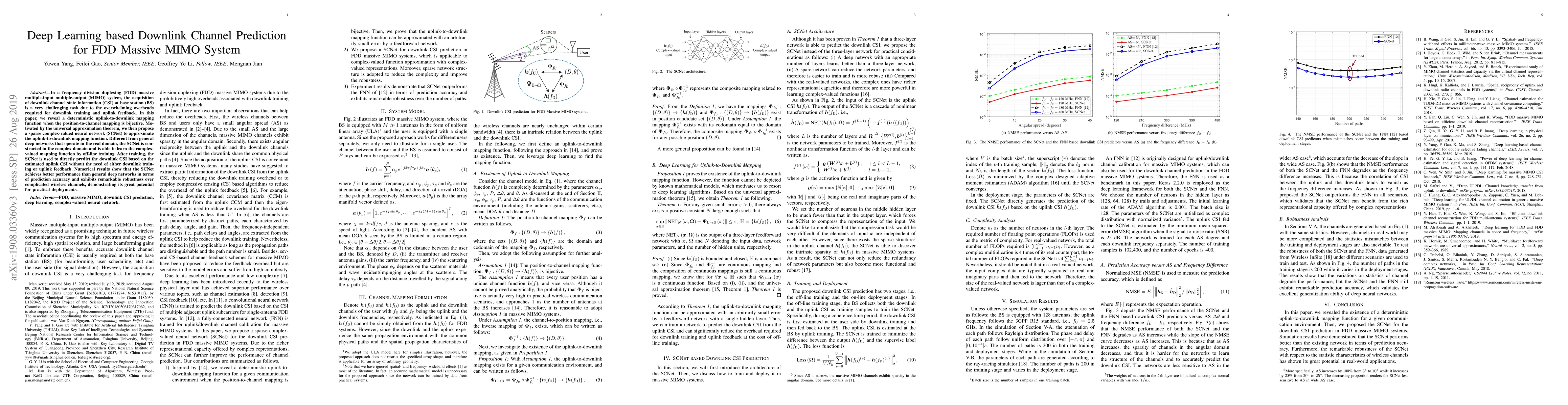 In a frequency division duplexing (FDD) massive multiple-input multiple-output (MIMO) system, the acquisition of downlink channel state information (CSI) at base station (BS) is a very challenging task due to the overwhelming overheads required for downlink training and uplink feedback. In this paper, we reveal a deterministic uplink-to-downlink mapping function when the position-to-channel mapping is bijective. Motivated by the universal approximation theorem, we then propose a sparse complex-valued neural network (SCNet) to approximate the uplink-to-downlink mapping function. Different from general deep networks that operate in the real domain, the SCNet is constructed in the complex domain and is able to learn the complex-valued mapping function by off-line training. After training, the SCNet is used to directly predict the downlink CSI based on the estimated uplink CSI without the need of either downlink training or uplink feedback. Numerical results show that the SCNet achieves better performance than general deep networks in terms of prediction accuracy and exhibits remarkable robustness over complicated wireless channels, demonstrating its great potential for practical deployments.