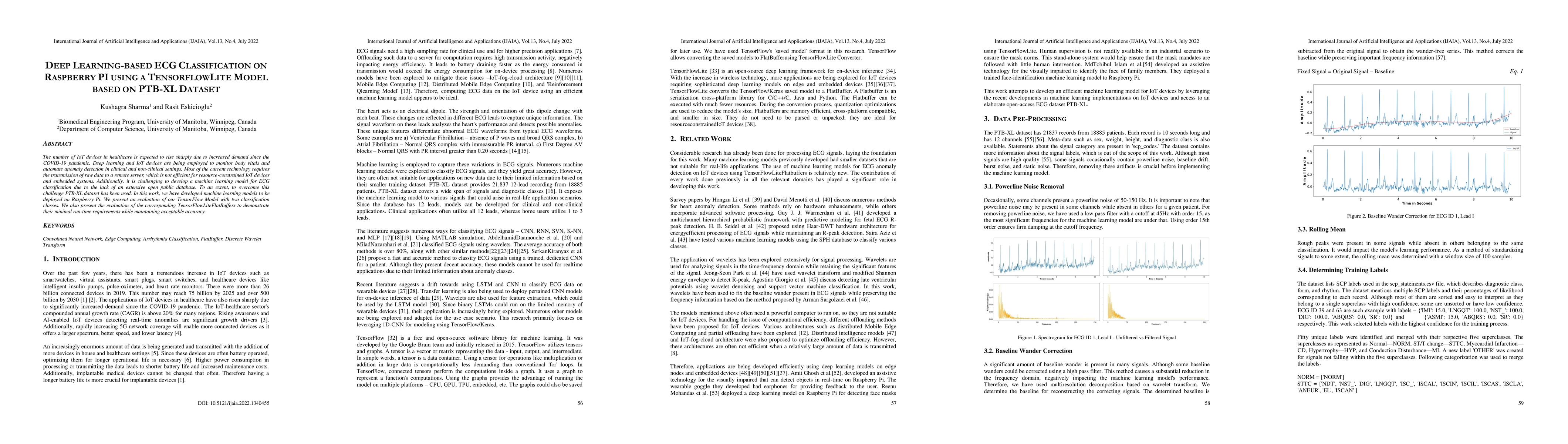 The number of IoT devices in healthcare is expected to rise sharply due to increased demand since the COVID-19 pandemic. Deep learning and IoT devices are being employed to monitor body vitals and automate anomaly detection in clinical and non-clinical settings. Most of the current technology requires the transmission of raw data to a remote server, which is not efficient for resource-constrained IoT devices and embedded systems. Additionally, it is challenging to develop a machine learning model for ECG classification due to the lack of an extensive open public database. To an extent, to overcome this challenge PTB-XL dataset has been used. In this work, we have developed machine learning models to be deployed on Raspberry Pi. We present an evaluation of our TensorFlow Model with two classification classes. We also present the evaluation of the corresponding TensorFlow Lite FlatBuffers to demonstrate their minimal run-time requirements while maintaining acceptable accuracy.