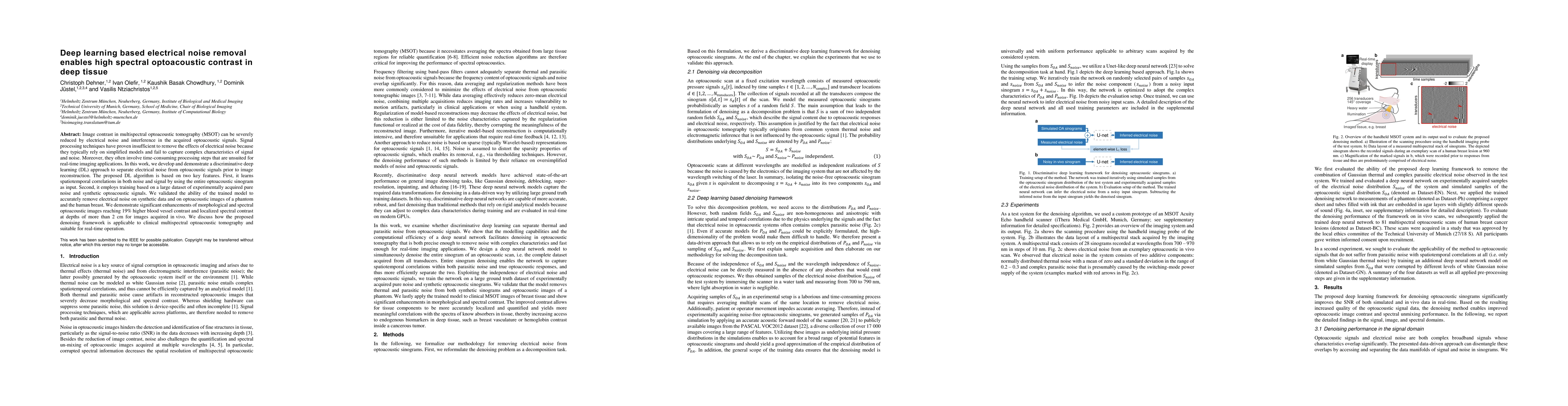 Image contrast in multispectral optoacoustic tomography (MSOT) can be severely reduced by electrical noise and interference in the acquired optoacoustic signals. Signal processing techniques have proven insufficient to remove the effects of electrical noise because they typically rely on simplified models and fail to capture complex characteristics of signal and noise. Moreover, they often involve time-consuming processing steps that are unsuited for real-time imaging applications. In this work, we develop and demonstrate a discriminative deep learning (DL) approach to separate electrical noise from optoacoustic signals prior to image reconstruction. The proposed DL algorithm is based on two key features. First, it learns spatiotemporal correlations in both noise and signal by using the entire optoacoustic sinogram as input. Second, it employs training based on a large dataset of experimentally acquired pure noise and synthetic optoacoustic signals. We validated the ability of the trained model to accurately remove electrical noise on synthetic data and on optoacoustic images of a phantom and the human breast. We demonstrate significant enhancements of morphological and spectral optoacoustic images reaching 19% higher blood vessel contrast and localized spectral contrast at depths of more than 2 cm for images acquired in vivo. We discuss how the proposed denoising framework is applicable to clinical multispectral optoacoustic tomography and suitable for real-time operation.