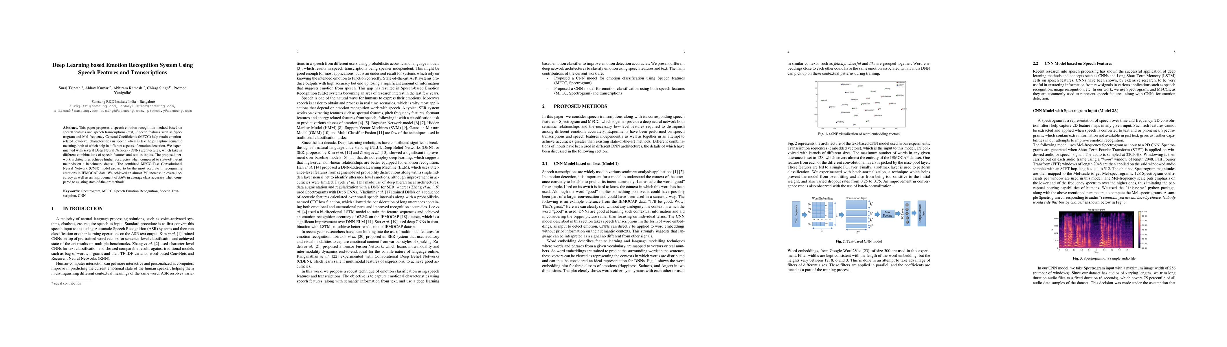 This paper proposes a deep learning-based emotion recognition system using speech features and transcriptions, achieving higher accuracy than state-of-the-art methods. The combined MFCC-Text CNN model proved most effective in recognizing emotions from the IEMOCAP dataset.