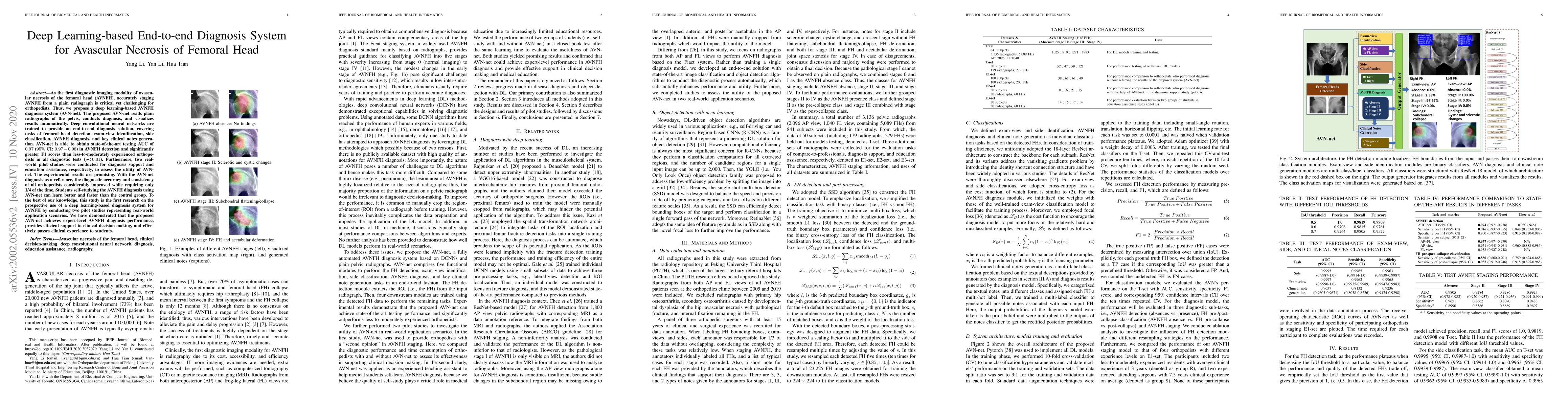As the first diagnostic imaging modality of avascular necrosis of the femoral head (AVNFH), accurately staging AVNFH from a plain radiograph is critical yet challenging for orthopedists. Thus, we propose a deep learning-based AVNFH diagnosis system (AVN-net). The proposed AVN-net reads plain radiographs of the pelvis, conducts diagnosis, and visualizes results automatically. Deep convolutional neural networks are trained to provide an end-to-end diagnosis solution, covering tasks of femoral head detection, exam-view identification, side classification, AVNFH diagnosis, and key clinical notes generation. AVN-net is able to obtain state-of-the-art testing AUC of 0.97 (95% CI: 0.97-0.98) in AVNFH detection and significantly greater F1 scores than less-to-moderately experienced orthopedists in all diagnostic tests (p<0.01). Furthermore, two real-world pilot studies were conducted for diagnosis support and education assistance, respectively, to assess the utility of AVN-net. The experimental results are promising. With the AVN-net diagnosis as a reference, the diagnostic accuracy and consistency of all orthopedists considerably improved while requiring only 1/4 of the time. Students self-studying the AVNFH diagnosis using AVN-net can learn better and faster than the control group. To the best of our knowledge, this study is the first research on the prospective use of a deep learning-based diagnosis system for AVNFH by conducting two pilot studies representing real-world application scenarios. We have demonstrated that the proposed AVN-net achieves expert-level AVNFH diagnosis performance, provides efficient support in clinical decision-making, and effectively passes clinical experience to students.