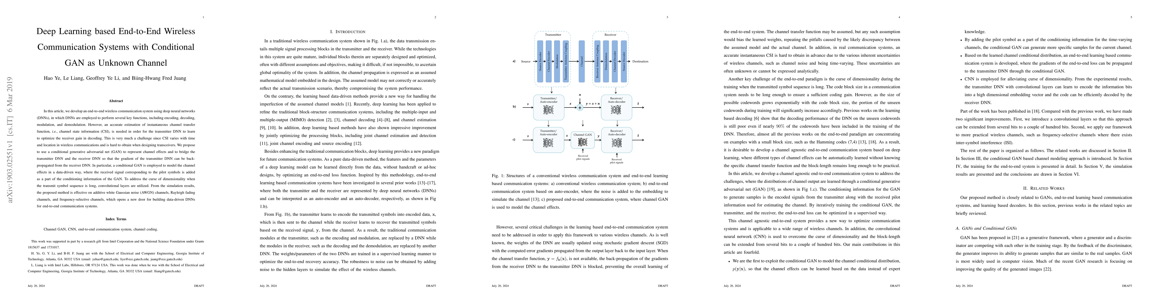 This paper proposes an end-to-end wireless communication system using deep neural networks (DNNs) for encoding, decoding, modulation, and demodulation, addressing the challenge of obtaining channel state information (CSI) with a conditional GAN to model channel effects and bridge transmitter and receiver DNNs. The method is shown to be effective across various channel types.