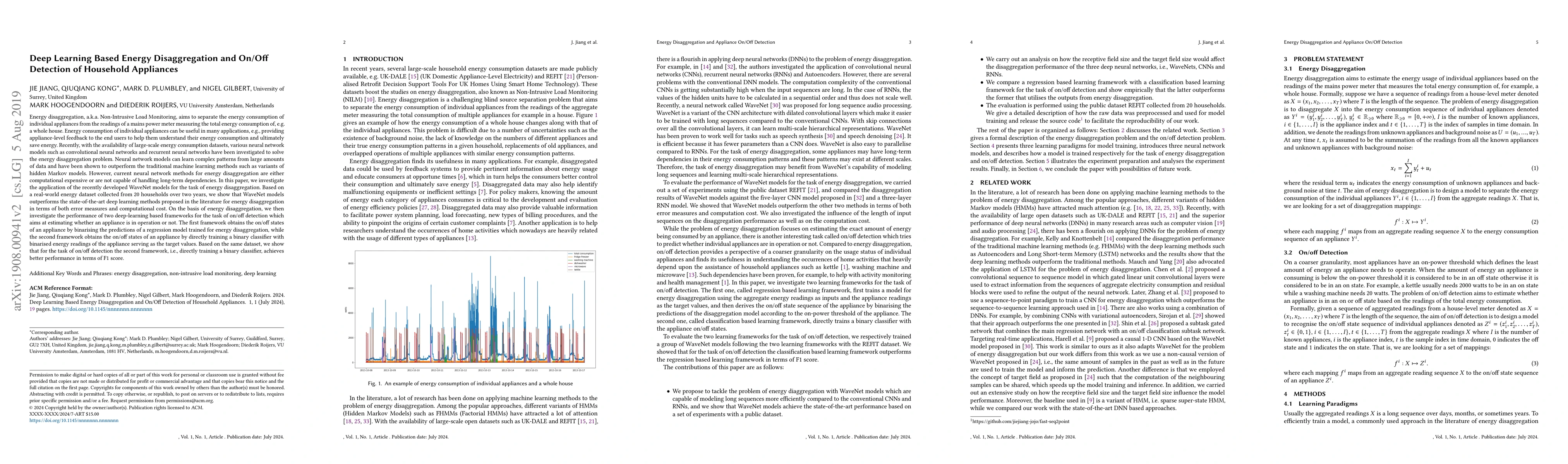 This paper explores the use of WaveNet models for energy disaggregation and on/off detection of household appliances, demonstrating superior performance over existing deep learning methods in terms of accuracy and computational efficiency. It also evaluates the effectiveness of two deep-learning frameworks for on/off detection, finding that a binary classifier yields better F1 scores.