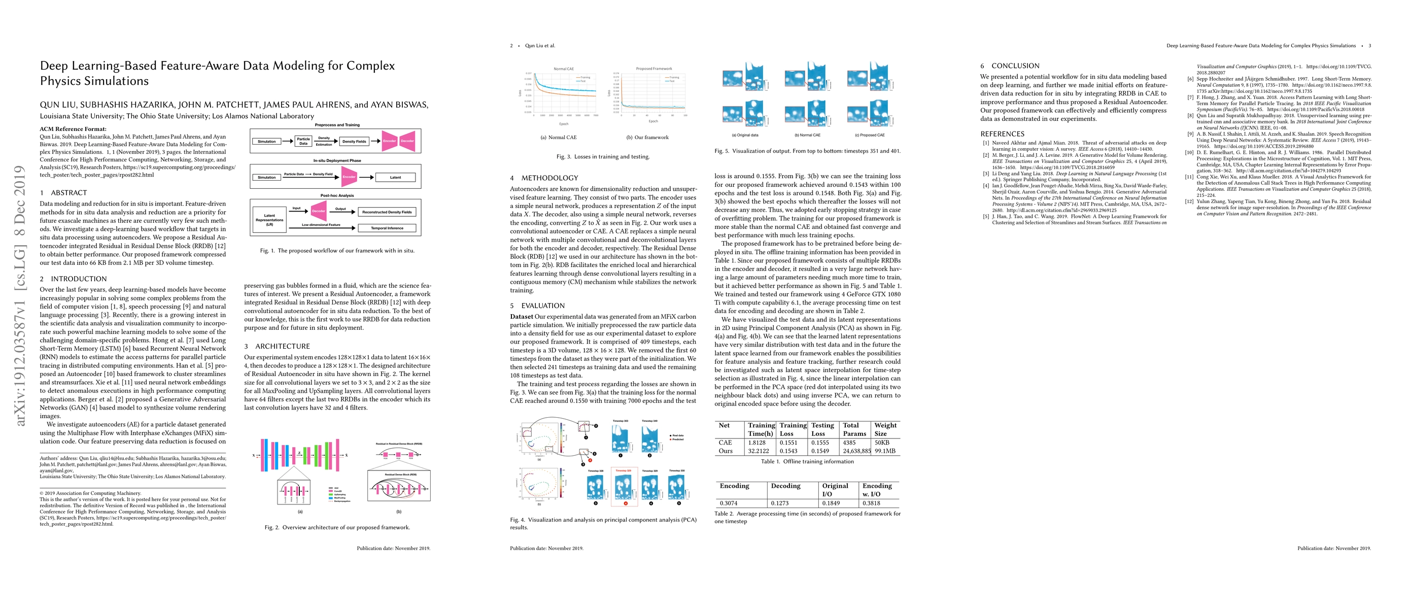 This paper proposes a deep learning-based framework using a Residual Autoencoder integrated Residual in Residual Dense Block (RRDB) for in situ data modeling and reduction in complex physics simulations. The method achieves significant data compression, reducing test data from 2.1 MB to 66 KB per 3D volume timestep.