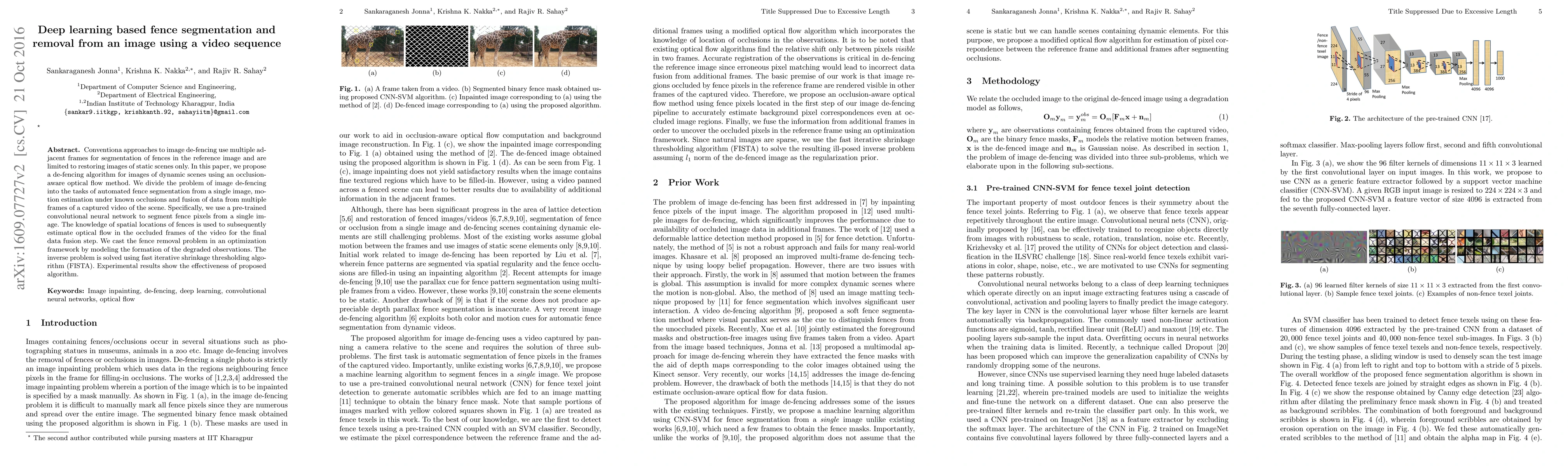Conventional approaches to image de-fencing use multiple adjacent frames for segmentation of fences in the reference image and are limited to restoring images of static scenes only. In this paper, we propose a de-fencing algorithm for images of dynamic scenes using an occlusion-aware optical flow method. We divide the problem of image de-fencing into the tasks of automated fence segmentation from a single image, motion estimation under known occlusions and fusion of data from multiple frames of a captured video of the scene. Specifically, we use a pre-trained convolutional neural network to segment fence pixels from a single image. The knowledge of spatial locations of fences is used to subsequently estimate optical flow in the occluded frames of the video for the final data fusion step. We cast the fence removal problem in an optimization framework by modeling the formation of the degraded observations. The inverse problem is solved using fast iterative shrinkage thresholding algorithm (FISTA). Experimental results show the effectiveness of proposed algorithm.