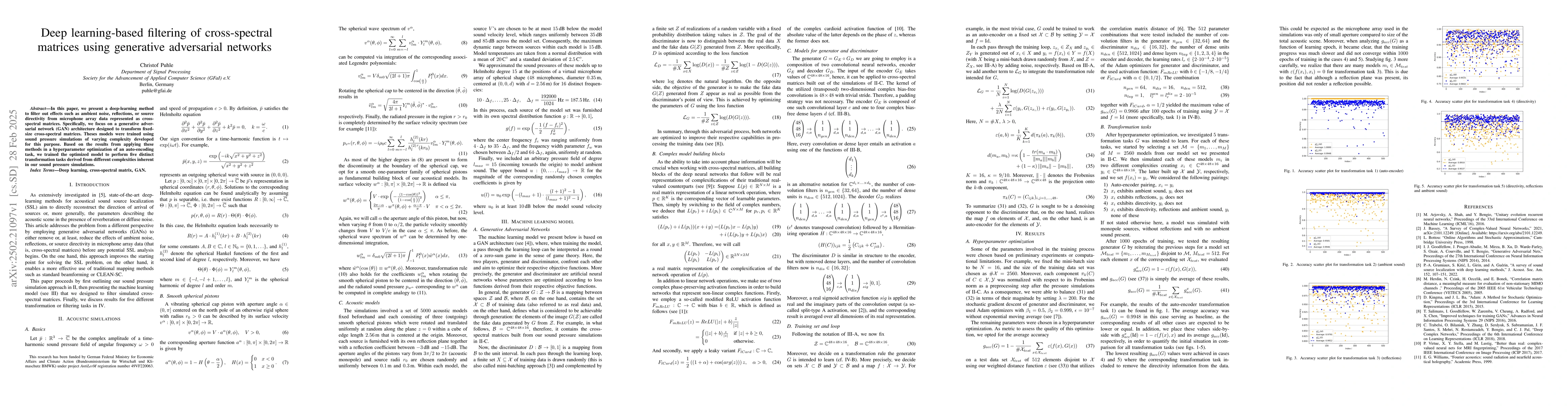 The research presents a deep learning method using Generative Adversarial Networks (GANs) to filter out ambient noise, reflections, and source directivity from microphone array data represented as cross-spectral matrices. The GAN architecture is trained on sound pressure simulations of varying complexity, with five distinct transformation tasks derived from different complexities inherent in the simulations.