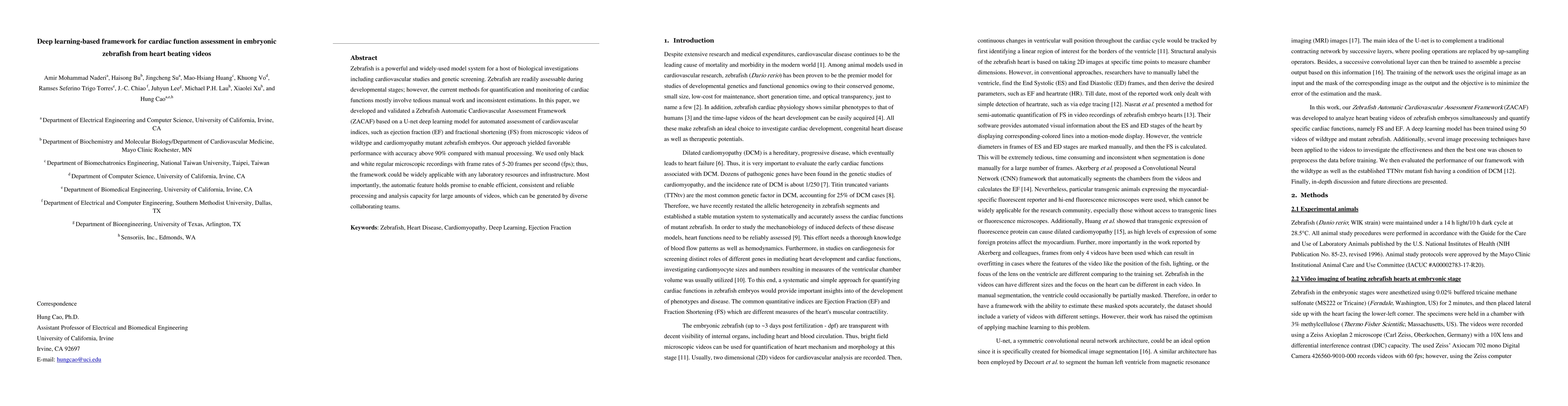 This paper presents a deep learning-based framework, ZACAF, utilizing a U-net model to automate the assessment of cardiac functions in embryonic zebrafish from heart beating videos, achieving over 90% accuracy compared to manual methods. The framework is applicable to any laboratory with basic resources, promising efficient and consistent analysis for large video datasets.
