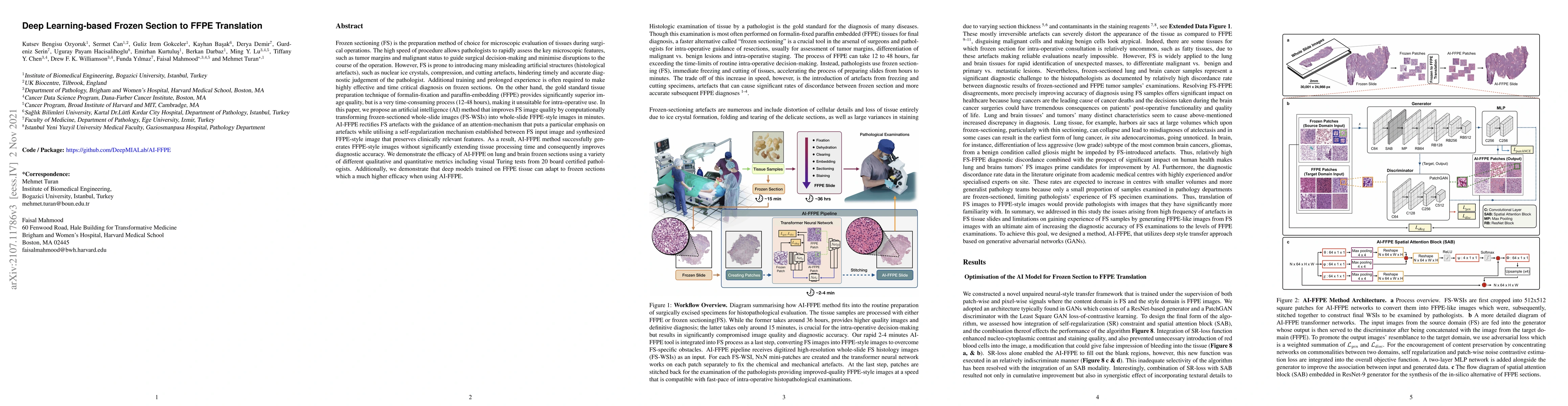 This research introduces AI-FFPE, a method that transforms frozen section images into FFPE-style images in minutes, rectifying artefacts and improving diagnostic accuracy without extending tissue processing time. The efficacy of AI-FFPE is demonstrated on lung and brain frozen sections using various metrics and visual Turing tests by 20 board-certified pathologists.