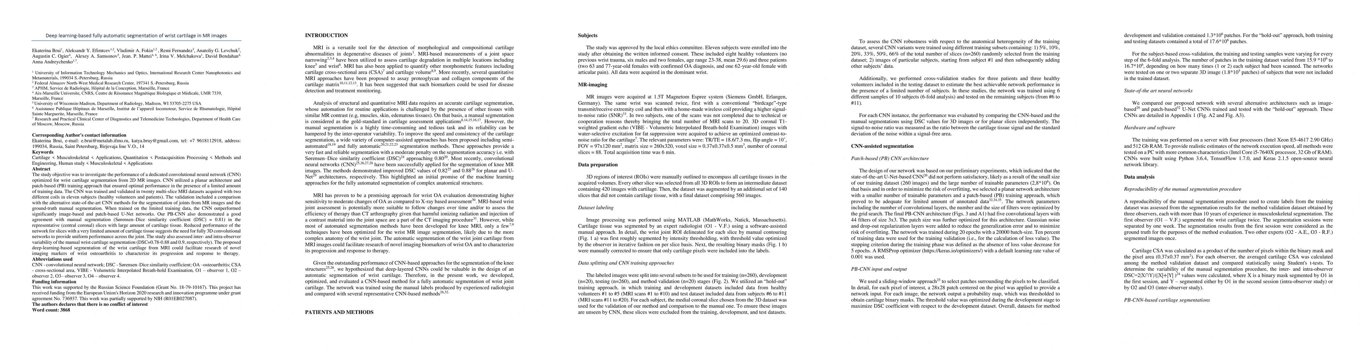 This study developed a deep learning-based convolutional neural network (CNN) for automatic wrist cartilage segmentation in 2D MR images, achieving high accuracy (DSC = 0.81) compared to manual segmentation. The network's performance suggests potential for advancing research on wrist osteoarthritis imaging markers.