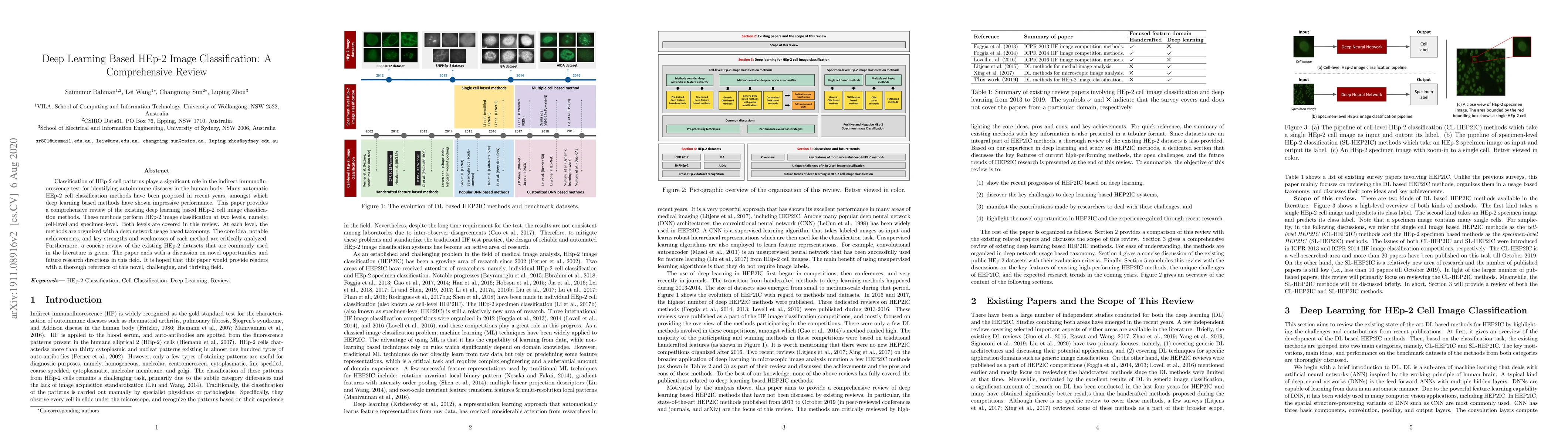 This paper reviews deep learning methods for HEp-2 cell image classification, analyzing both cell-level and specimen-level approaches, and discusses their strengths, weaknesses, and future research directions. It also covers commonly used HEp-2 datasets and provides a taxonomy of deep network usage.