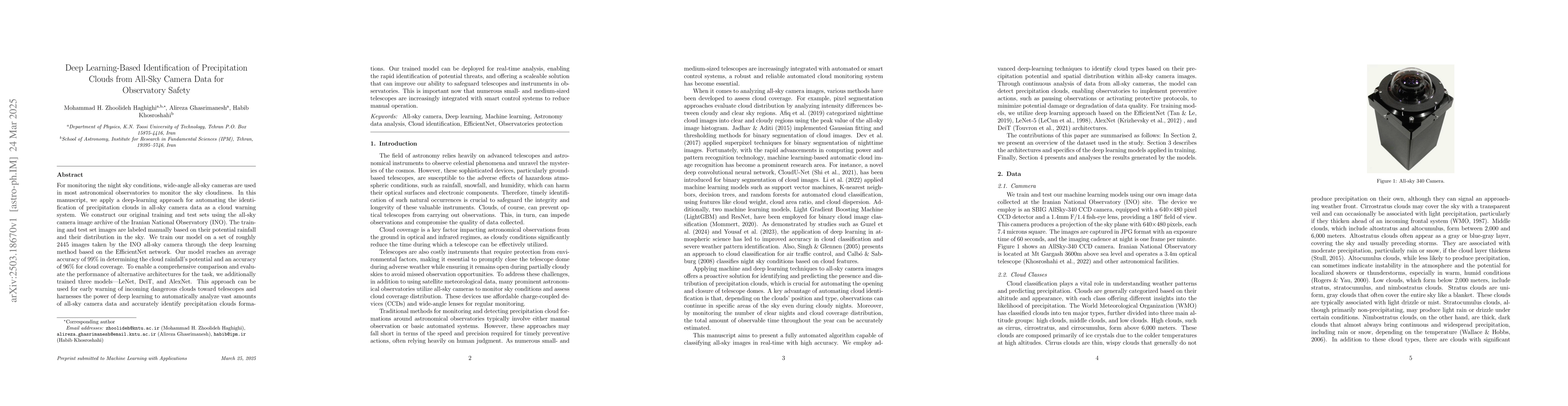This work stands out by applying deep learning techniques specifically to all-sky camera data for precipitation cloud identification, offering a scalable and automated solution for observatory safety.