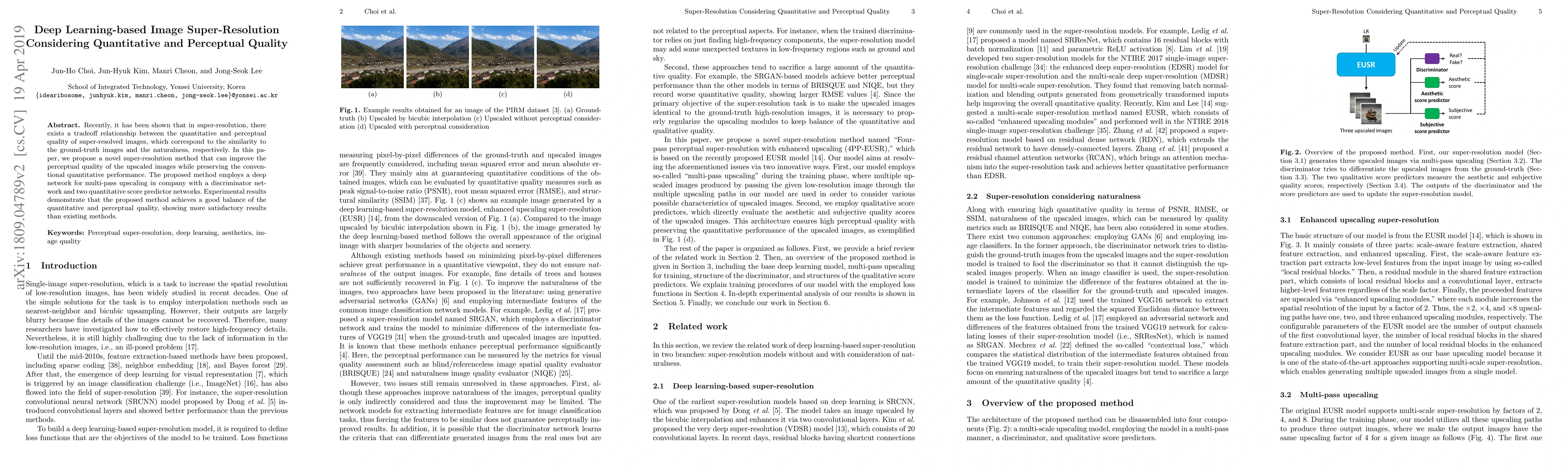 This paper proposes a deep learning-based super-resolution method that enhances the perceptual quality of upscaled images while maintaining quantitative performance. The method uses a multi-pass upscaling deep network, a discriminator, and two quantitative score predictors to achieve a balanced improvement.
