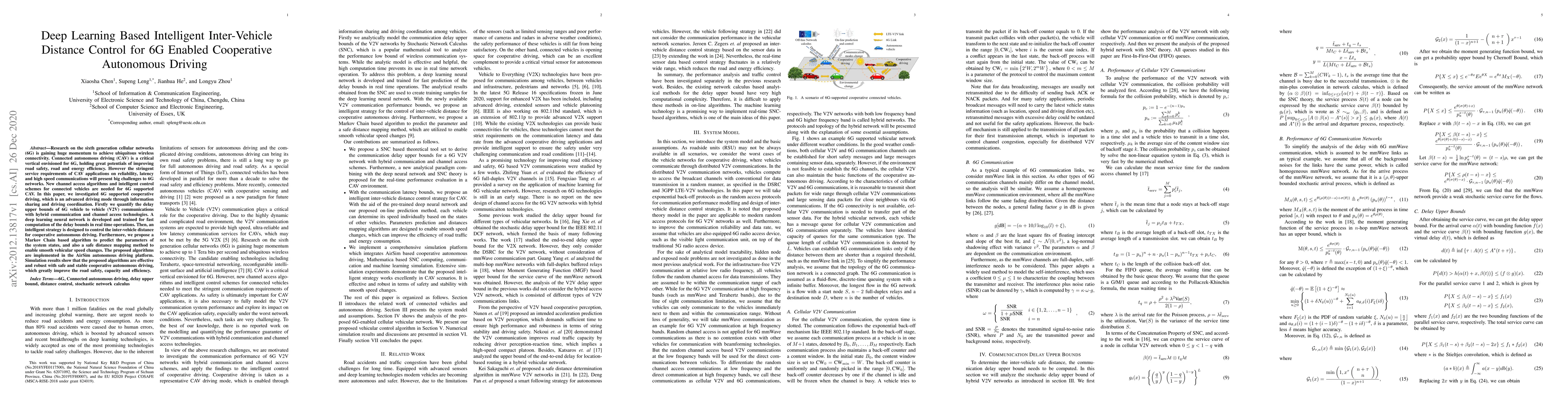 Research on the sixth generation cellular networks (6G) is gaining huge momentum to achieve ubiquitous wireless connectivity. Connected autonomous driving (CAV) is a critical vertical envisioned for 6G, holding great potentials of improving road safety, road and energy efficiency. However the stringent service requirements of CAV applications on reliability, latency and high speed communications will present big challenges to 6G networks. New channel access algorithms and intelligent control schemes for connected vehicles are needed for 6G supported CAV. In this paper, we investigated 6G supported cooperative driving, which is an advanced driving mode through information sharing and driving coordination. Firstly we quantify the delay upper bounds of 6G vehicle to vehicle (V2V) communications with hybrid communication and channel access technologies. A deep learning neural network is developed and trained for fast computation of the delay bounds in real time operations. Then, an intelligent strategy is designed to control the inter-vehicle distance for cooperative autonomous driving. Furthermore, we propose a Markov Chain based algorithm to predict the parameters of the system states, and also a safe distance mapping method to enable smooth vehicular speed changes. The proposed algorithms are implemented in the AirSim autonomous driving platform. Simulation results show that the proposed algorithms are effective and robust with safe and stable cooperative autonomous driving, which greatly improve the road safety, capacity and efficiency.