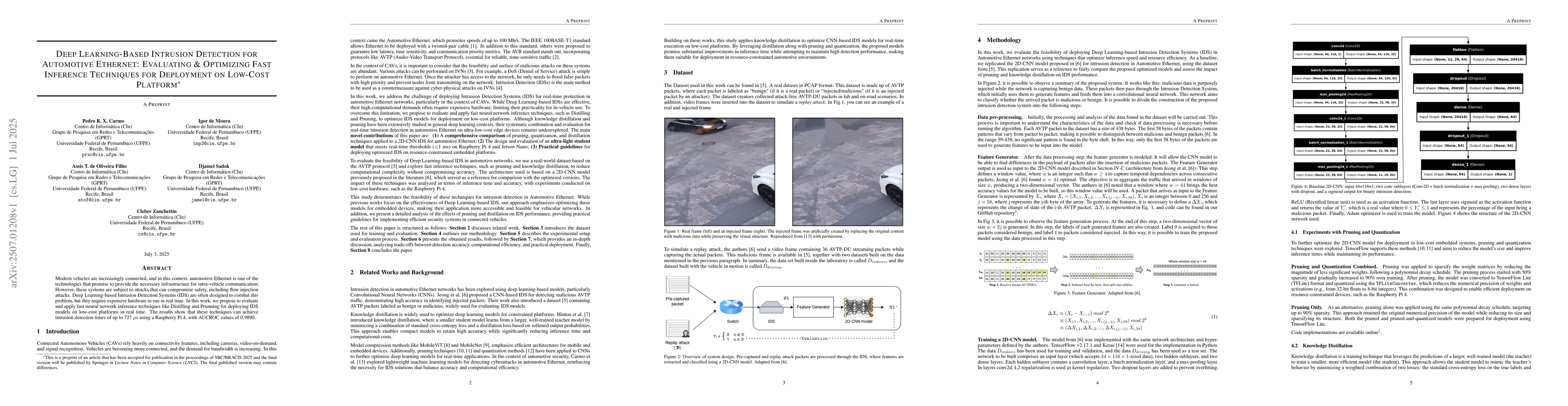 Modern vehicles are increasingly connected, and in this context, automotive Ethernet is one of the technologies that promise to provide the necessary infrastructure for intra-vehicle communication. However, these systems are subject to attacks that can compromise safety, including flow injection attacks. Deep Learning-based Intrusion Detection Systems (IDS) are often designed to combat this problem, but they require expensive hardware to run in real time. In this work, we propose to evaluate and apply fast neural network inference techniques like Distilling and Prunning for deploying IDS models on low-cost platforms in real time. The results show that these techniques can achieve intrusion detection times of up to 727 {\mu}s using a Raspberry Pi 4, with AUCROC values of 0.9890.