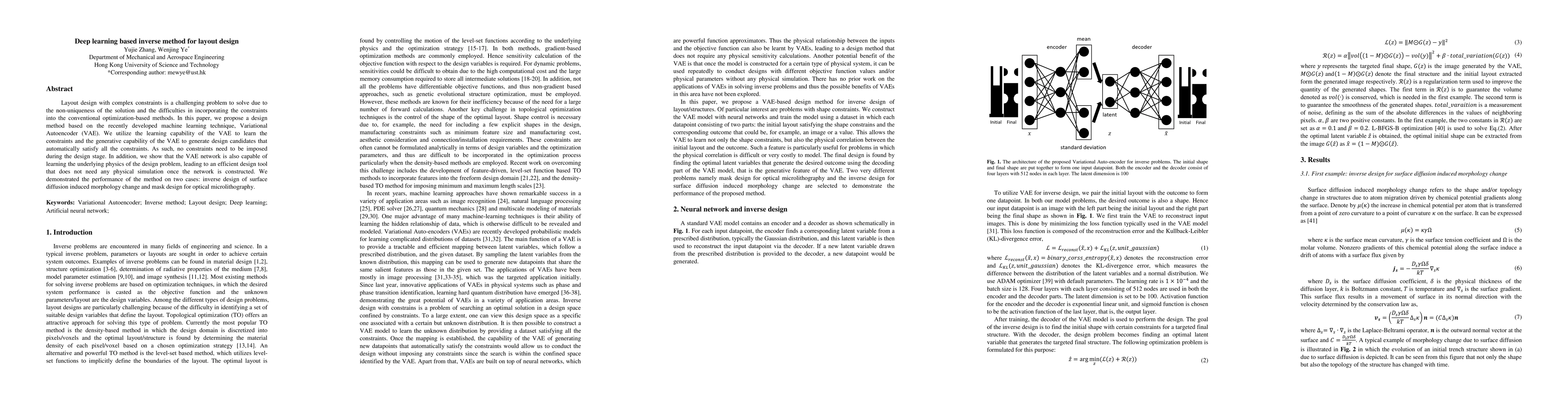 Layout design with complex constraints is a challenging problem to solve due to the non-uniqueness of the solution and the difficulties in incorporating the constraints into the conventional optimization-based methods. In this paper, we propose a design method based on the recently developed machine learning technique, Variational Autoencoder (VAE). We utilize the learning capability of the VAE to learn the constraints and the generative capability of the VAE to generate design candidates that automatically satisfy all the constraints. As such, no constraints need to be imposed during the design stage. In addition, we show that the VAE network is also capable of learning the underlying physics of the design problem, leading to an efficient design tool that does not need any physical simulation once the network is constructed. We demonstrated the performance of the method on two cases: inverse design of surface diffusion induced morphology change and mask design for optical microlithography.