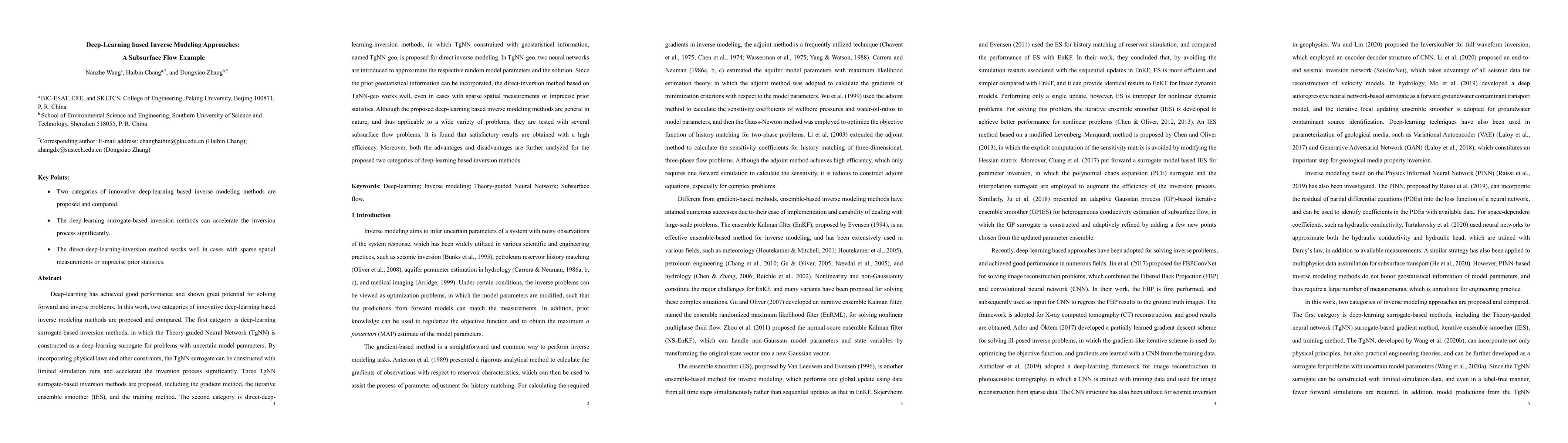This paper proposes two categories of deep-learning based inverse modeling methods for subsurface flow problems: TgNN surrogate-based inversion methods and TgNN-geo direct-deep-learning inversion methods. Both methods show high efficiency and satisfactory results, especially in scenarios with sparse data or imprecise priors.