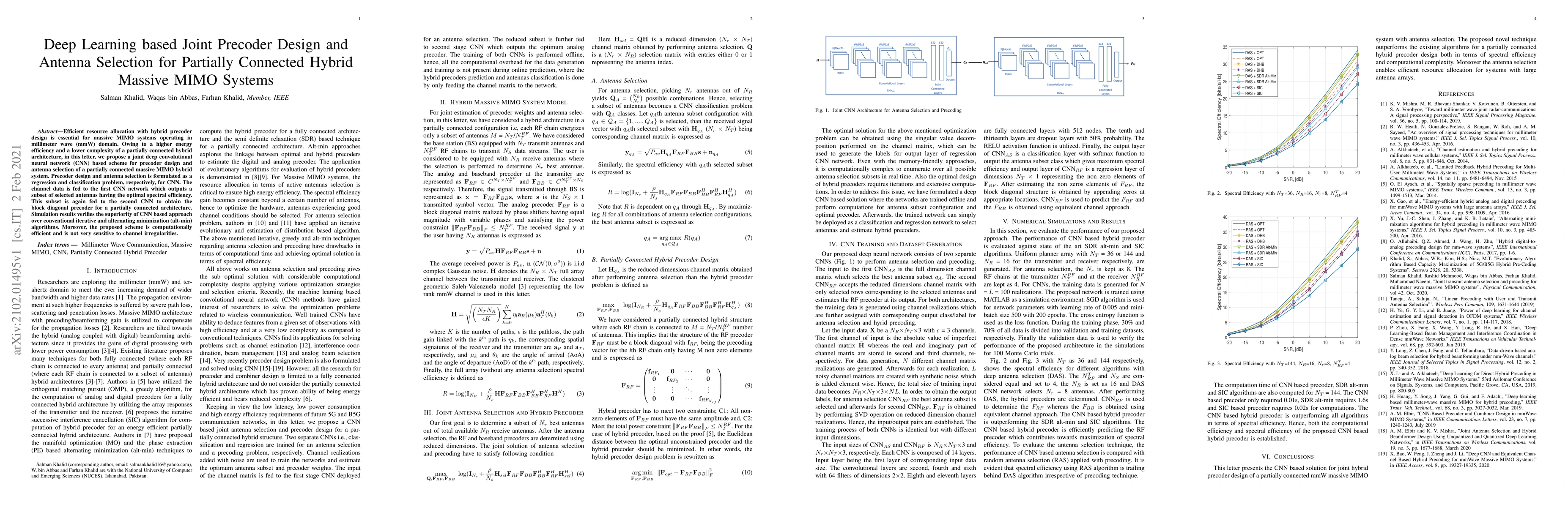 This paper proposes a deep convolutional neural network (CNN) based joint precoder design and antenna selection scheme for partially connected hybrid massive MIMO systems, demonstrating superior performance and computational efficiency compared to conventional algorithms. The CNN approach effectively selects optimal antennas and designs precoders, showing robustness to channel variations.