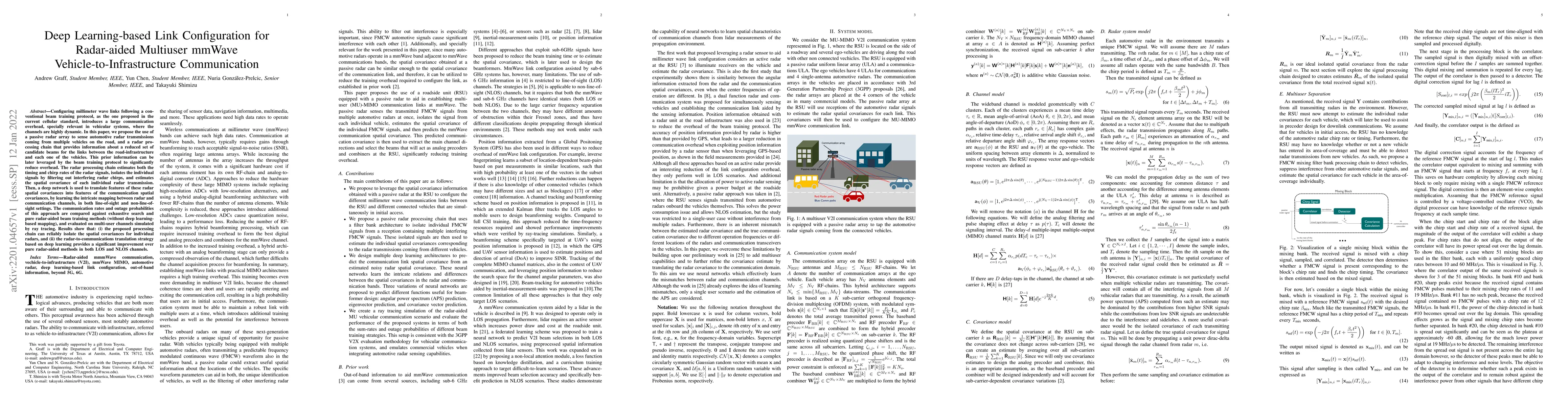 This paper proposes a deep learning-based method to configure millimeter wave links for vehicle-to-infrastructure communication using radar-aided sensing. The method leverages radar to estimate candidate beams, significantly reducing communication overhead compared to conventional protocols.