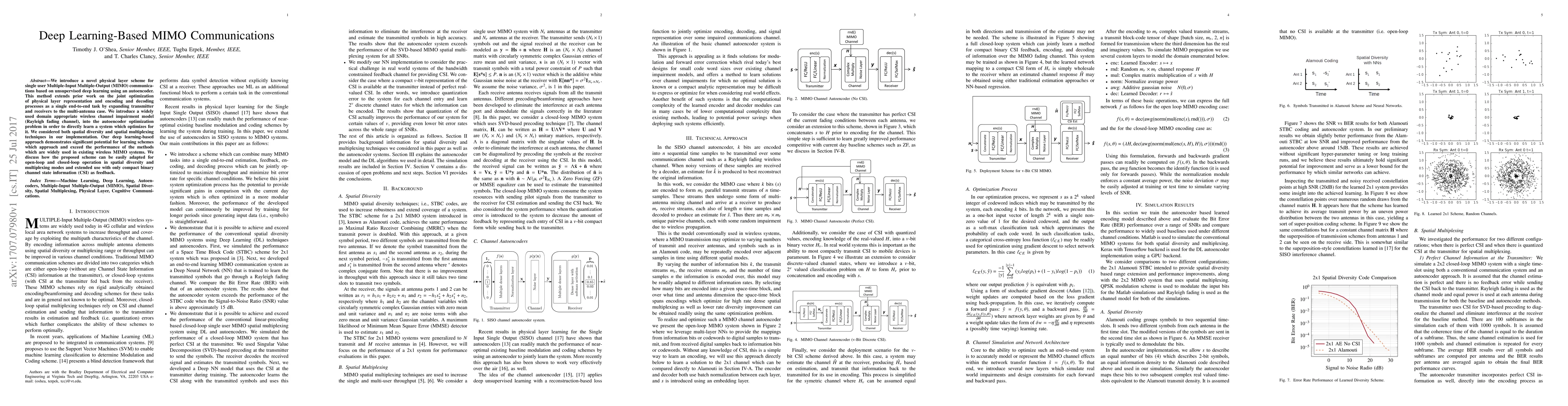 This paper proposes a novel deep learning-based MIMO communication scheme using an autoencoder for unsupervised learning, optimizing both spatial diversity and multiplexing. The approach shows potential to outperform traditional MIMO methods by directly learning from a Rayleigh fading channel model.