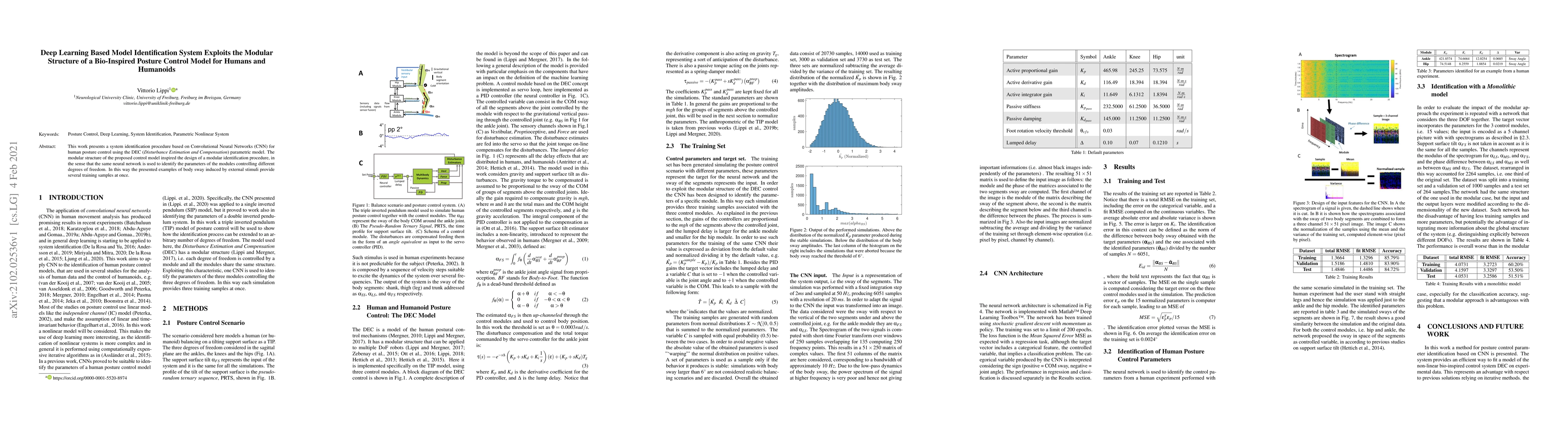 This work presents a system identification procedure based on Convolutional Neural Networks (CNN) for human posture control using the DEC (Disturbance Estimation and Compensation) parametric model. The modular structure of the proposed control model inspired the design of a modular identification procedure, in the sense that the same neural network is used to identify the parameters of the modules controlling different degrees of freedom. In this way the presented examples of body sway induced by external stimuli provide several training samples at once