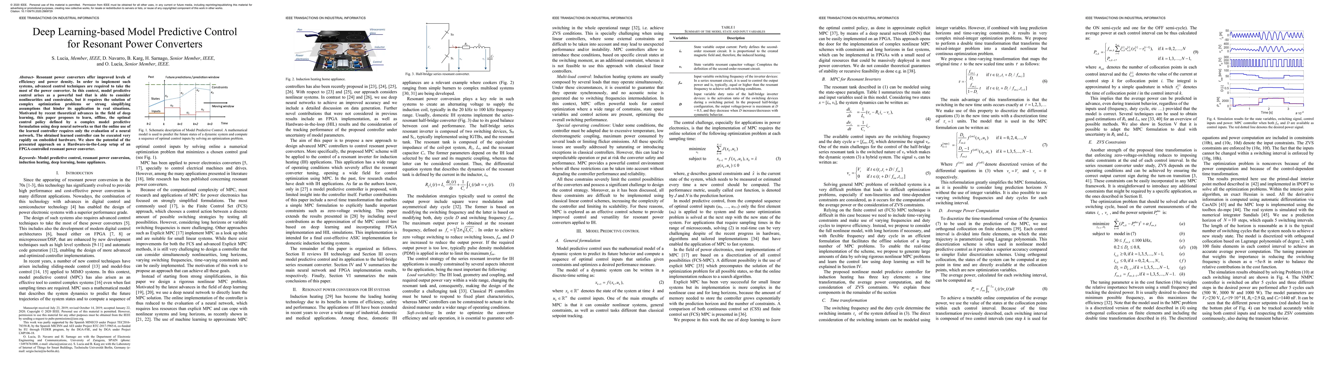 This paper proposes a deep learning-based model predictive control method for resonant power converters, leveraging neural networks to learn optimal control policies offline for rapid execution on embedded hardware. The approach demonstrates effectiveness in a Hardware-in-the-Loop setup for an FPGA-controlled resonant power converter.