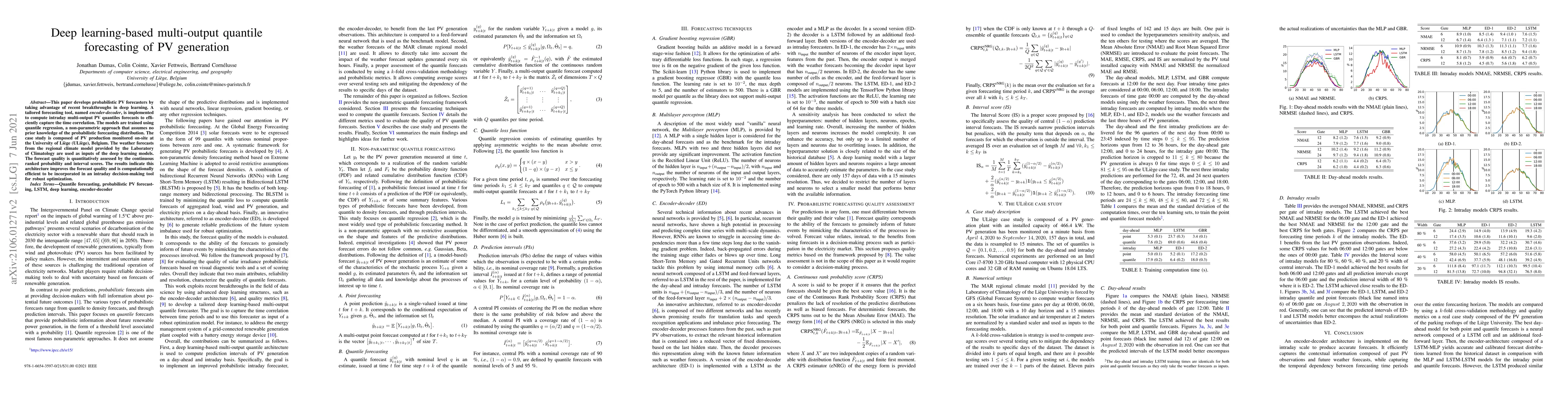 This paper introduces a deep learning-based encoder-decoder model for intraday multi-output quantile forecasting of photovoltaic (PV) generation, trained via quantile regression. The model, tested on PV data from the University of Liège, Belgium, shows improved forecast quality and computational efficiency for intraday decision-making.