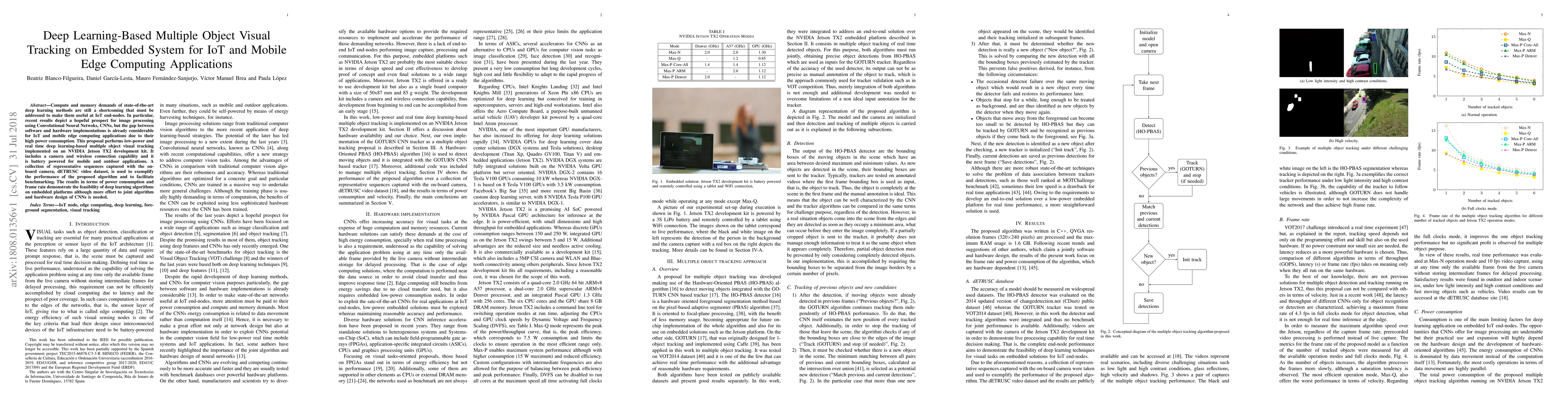Compute and memory demands of state-of-the-art deep learning methods are still a shortcoming that must be addressed to make them useful at IoT end-nodes. In particular, recent results depict a hopeful prospect for image processing using Convolutional Neural Netwoks, CNNs, but the gap between software and hardware implementations is already considerable for IoT and mobile edge computing applications due to their high power consumption. This proposal performs low-power and real time deep learning-based multiple object visual tracking implemented on an NVIDIA Jetson TX2 development kit. It includes a camera and wireless connection capability and it is battery powered for mobile and outdoor applications. A collection of representative sequences captured with the on-board camera, dETRUSC video dataset, is used to exemplify the performance of the proposed algorithm and to facilitate benchmarking. The results in terms of power consumption and frame rate demonstrate the feasibility of deep learning algorithms on embedded platforms although more effort to joint algorithm and hardware design of CNNs is needed.