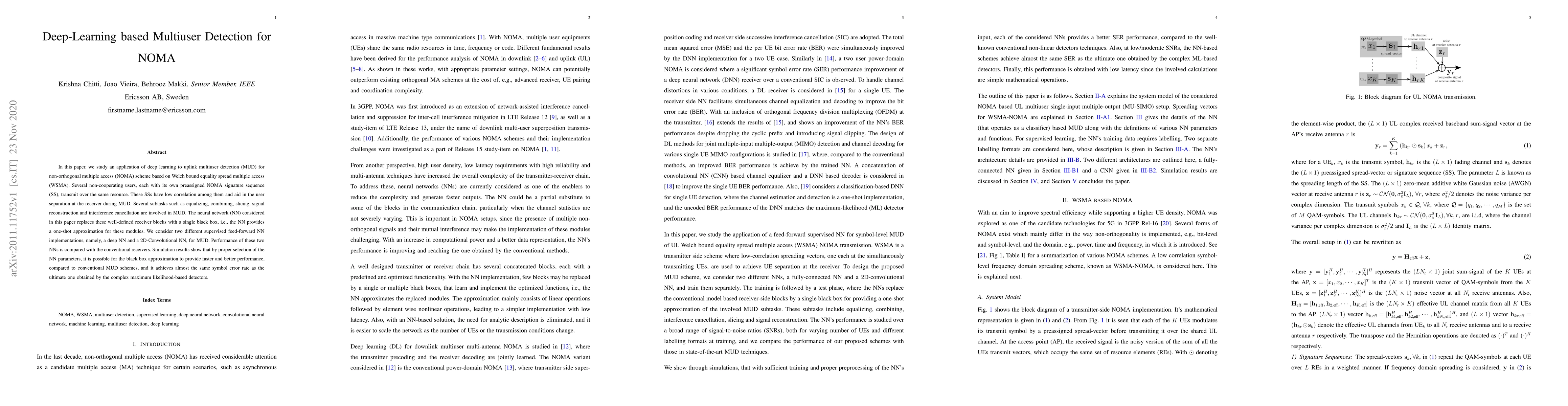 This paper explores deep learning for multiuser detection in NOMA systems, employing neural networks to replace traditional receiver blocks. Simulation results indicate that appropriately configured neural networks can outperform conventional methods in speed and achieve near-optimal symbol error rates.