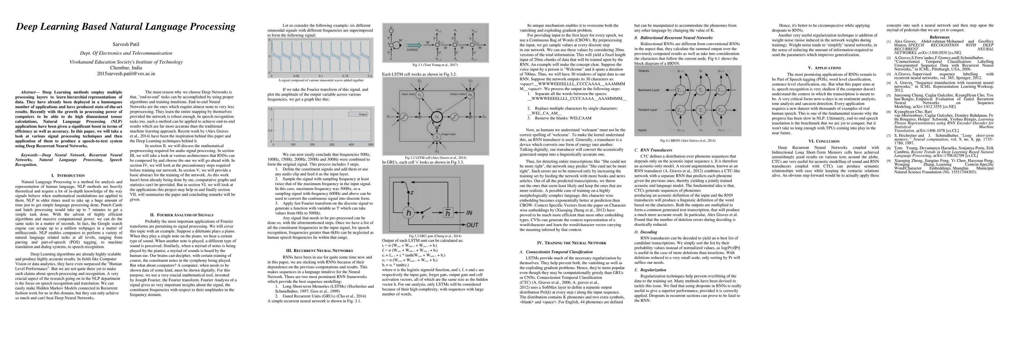 Deep Learning methods employ multiple processing layers to learn hierarchial representations of data. They have already been deployed in a humongous number of applications and have produced state-of-the-art results. Recently with the growth in processing power of computers to be able to do high dimensional tensor calculations, Natural Language Processing (NLP) applications have been given a significant boost in terms of efficiency as well as accuracy. In this paper, we will take a look at various signal processing techniques and then application of them to produce a speech-to-text system using Deep Recurrent Neural Networks.