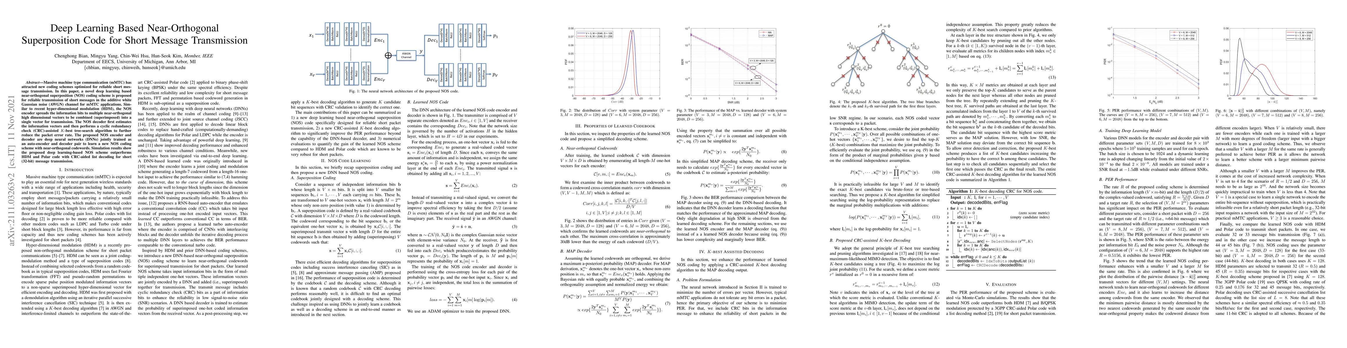 Massive machine type communication (mMTC) has attracted new coding schemes optimized for reliable short message transmission. In this paper, a novel deep learning based near-orthogonal superposition (NOS) coding scheme is proposed for reliable transmission of short messages in the additive white Gaussian noise (AWGN) channel for mMTC applications. Similar to recent hyper-dimensional modulation (HDM), the NOS encoder spreads the information bits to multiple near-orthogonal high dimensional vectors to be combined (superimposed) into a single vector for transmission. The NOS decoder first estimates the information vectors and then performs a cyclic redundancy check (CRC)-assisted K-best tree-search algorithm to further reduce the packet error rate. The proposed NOS encoder and decoder are deep neural networks (DNNs) jointly trained as an auto encoder and decoder pair to learn a new NOS coding scheme with near-orthogonal codewords. Simulation results show the proposed deep learning-based NOS scheme outperforms HDM and Polar code with CRC-aided list decoding for short(32-bit) message transmission.