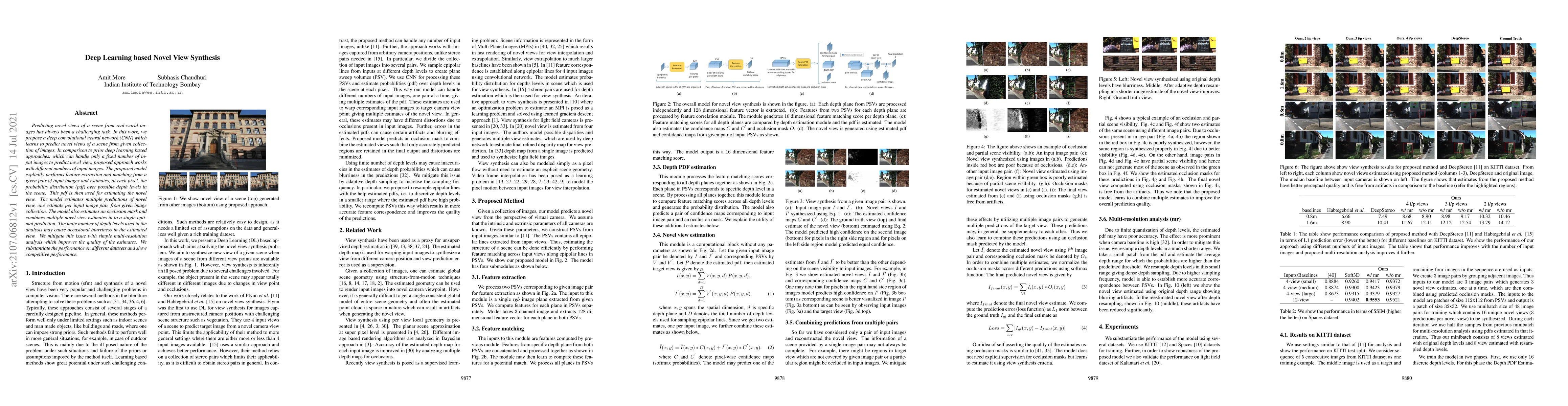 Predicting novel views of a scene from real-world images has always been a challenging task. In this work, we propose a deep convolutional neural network (CNN) which learns to predict novel views of a scene from given collection of images. In comparison to prior deep learning based approaches, which can handle only a fixed number of input images to predict novel view, proposed approach works with different numbers of input images. The proposed model explicitly performs feature extraction and matching from a given pair of input images and estimates, at each pixel, the probability distribution (pdf) over possible depth levels in the scene. This pdf is then used for estimating the novel view. The model estimates multiple predictions of novel view, one estimate per input image pair, from given image collection. The model also estimates an occlusion mask and combines multiple novel view estimates in to a single optimal prediction. The finite number of depth levels used in the analysis may cause occasional blurriness in the estimated view. We mitigate this issue with simple multi-resolution analysis which improves the quality of the estimates. We substantiate the performance on different datasets and show competitive performance.