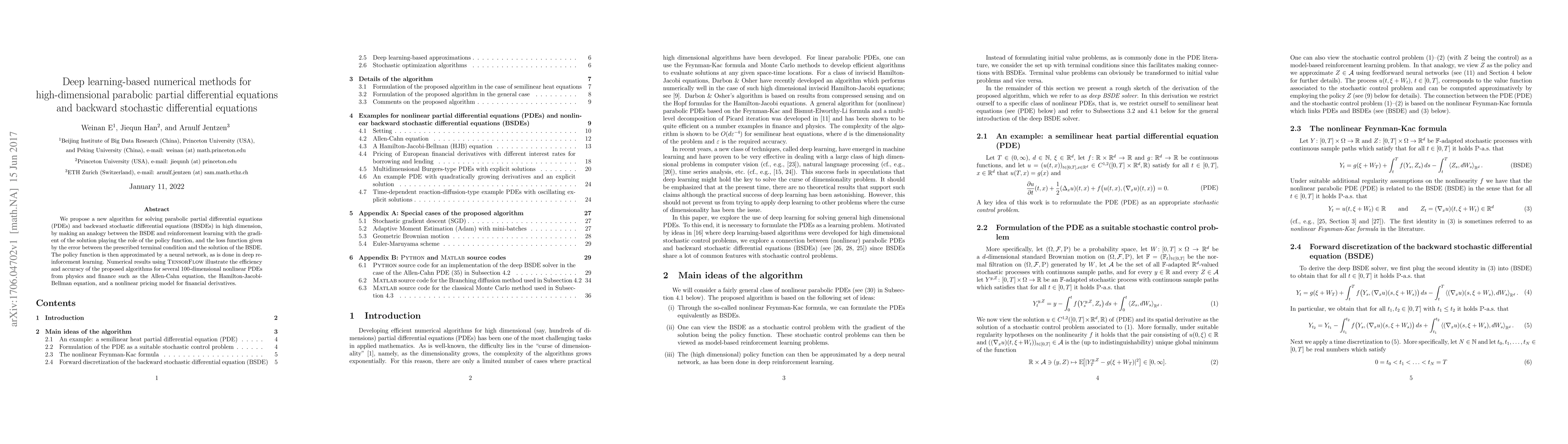 This paper introduces a deep learning algorithm that leverages reinforcement learning to solve high-dimensional parabolic PDEs and backward stochastic differential equations. The gradient of the solution is modeled as a policy function, approximated by a neural network, and demonstrated to be effective for complex 100-dimensional problems.