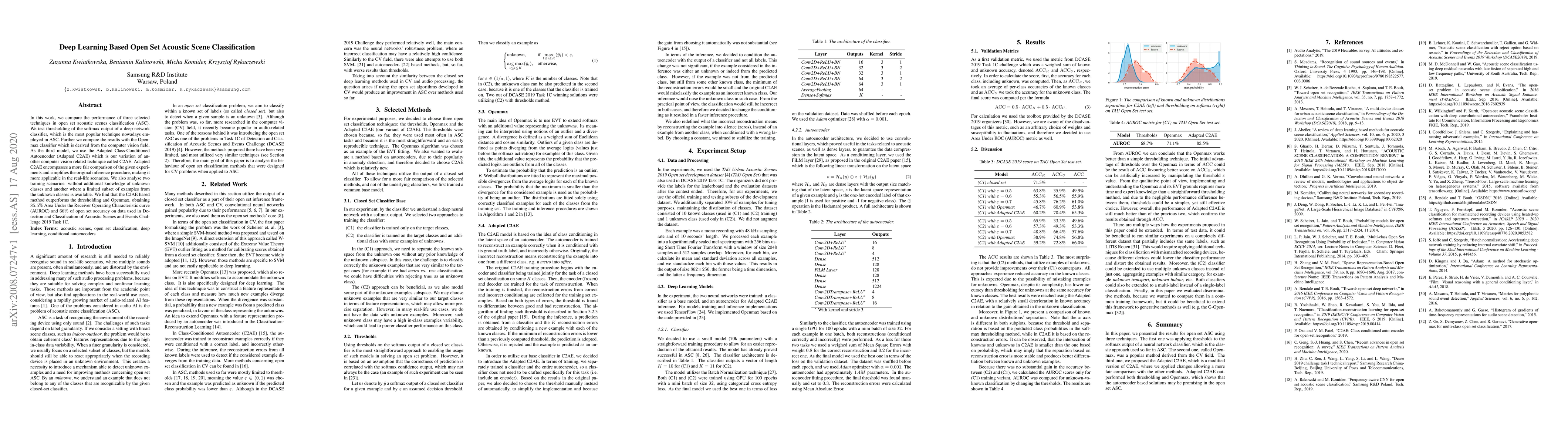 This paper compares three deep learning techniques for open set acoustic scene classification, finding that the Adapted Class-Conditioned Autoencoder (Adapted C2AE) outperforms thresholding and Openmax classifiers, achieving 85.5% AUROC and 66% open set accuracy. The study also evaluates training scenarios with and without unknown class data.
