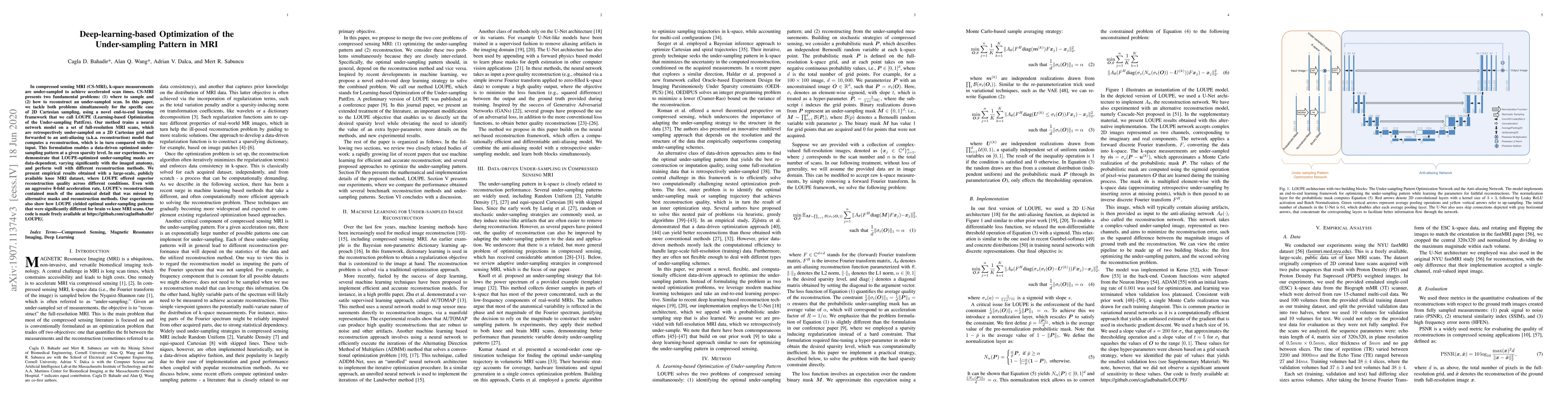 This paper introduces LOUPE, a deep-learning framework for optimizing under-sampling patterns in compressed sensing MRI (CS-MRI) to accelerate scan times. The method trains a neural network on full-resolution MRI scans to generate data-driven under-sampling masks, achieving superior reconstruction quality and anatomical detail preservation compared to alternative methods.