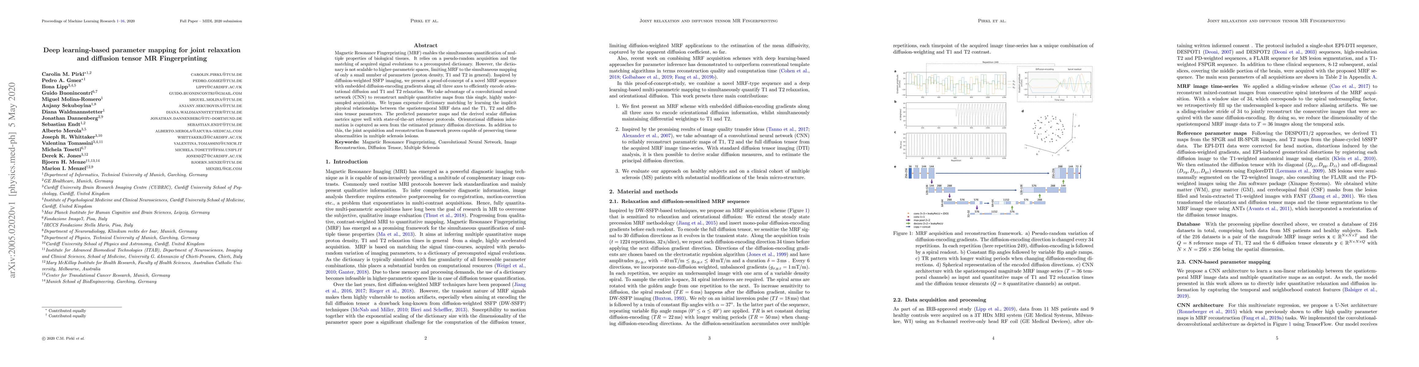 Magnetic Resonance Fingerprinting (MRF) enables the simultaneous quantification of multiple properties of biological tissues. It relies on a pseudo-random acquisition and the matching of acquired signal evolutions to a precomputed dictionary. However, the dictionary is not scalable to higher-parametric spaces, limiting MRF to the simultaneous mapping of only a small number of parameters (proton density, T1 and T2 in general). Inspired by diffusion-weighted SSFP imaging, we present a proof-of-concept of a novel MRF sequence with embedded diffusion-encoding gradients along all three axes to efficiently encode orientational diffusion and T1 and T2 relaxation. We take advantage of a convolutional neural network (CNN) to reconstruct multiple quantitative maps from this single, highly undersampled acquisition. We bypass expensive dictionary matching by learning the implicit physical relationships between the spatiotemporal MRF data and the T1, T2 and diffusion tensor parameters. The predicted parameter maps and the derived scalar diffusion metrics agree well with state-of-the-art reference protocols. Orientational diffusion information is captured as seen from the estimated primary diffusion directions. In addition to this, the joint acquisition and reconstruction framework proves capable of preserving tissue abnormalities in multiple sclerosis lesions.