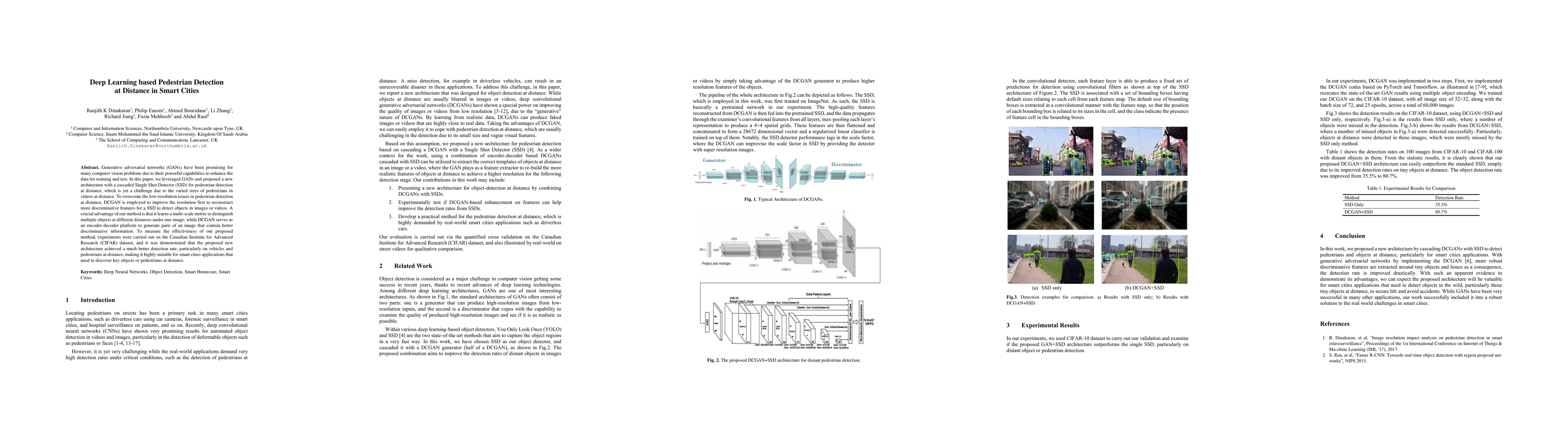A new method using Generative Adversarial Networks (GANs) and a cascaded Single Shot Detector (SSD) improves pedestrian detection at distance in smart cities by leveraging DCGAN to reconstruct images for better object features.