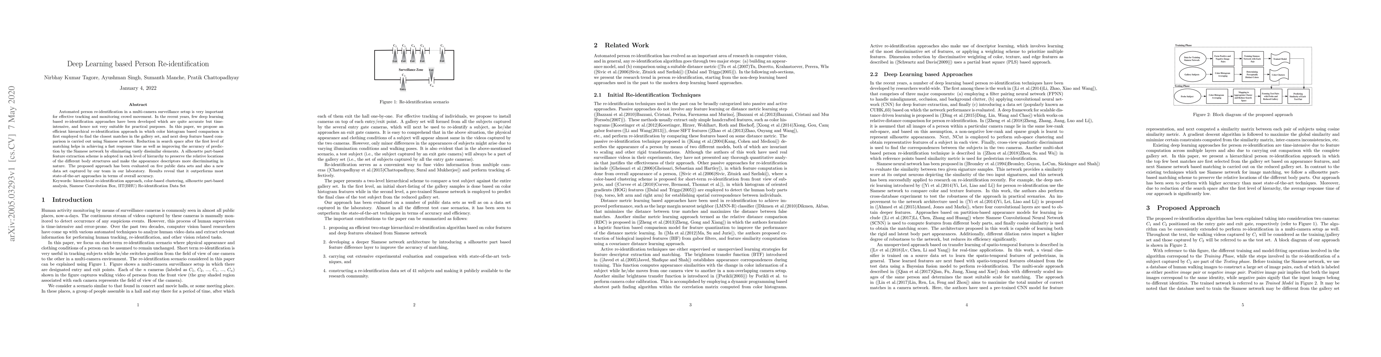 This paper proposes an efficient hierarchical deep learning method for person re-identification in surveillance systems, combining color histogram and Siamese network comparisons to reduce search space and improve accuracy. The method outperforms state-of-the-art approaches on multiple datasets.