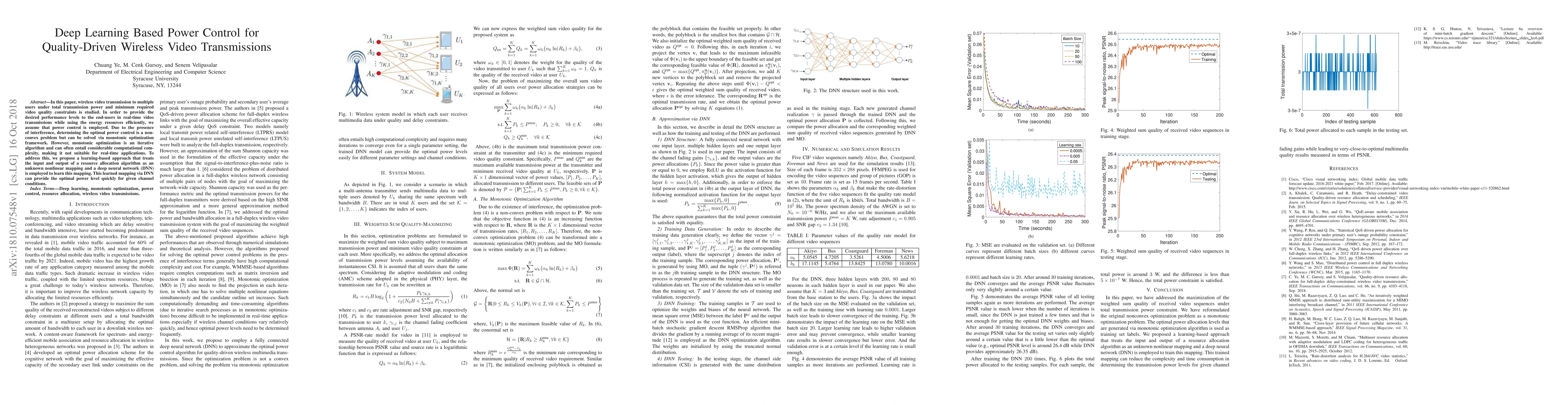 This paper proposes a deep learning-based power control method to optimize wireless video transmission for multiple users under power and quality constraints, using a deep neural network to efficiently determine optimal power levels in real-time. The approach aims to reduce computational complexity compared to traditional monotonic optimization methods.