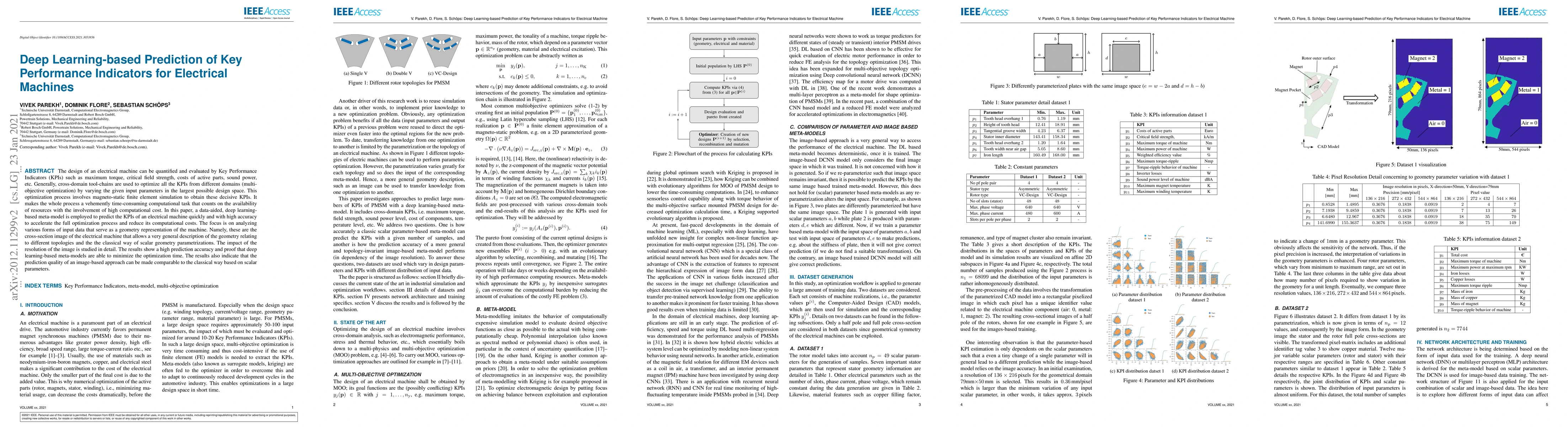 This paper proposes a deep learning-based meta-model to predict Key Performance Indicators (KPIs) for electrical machines, aiming to accelerate optimization and reduce computational costs. The model uses both image-based and scalar parametrization inputs, demonstrating high prediction accuracy and efficiency.