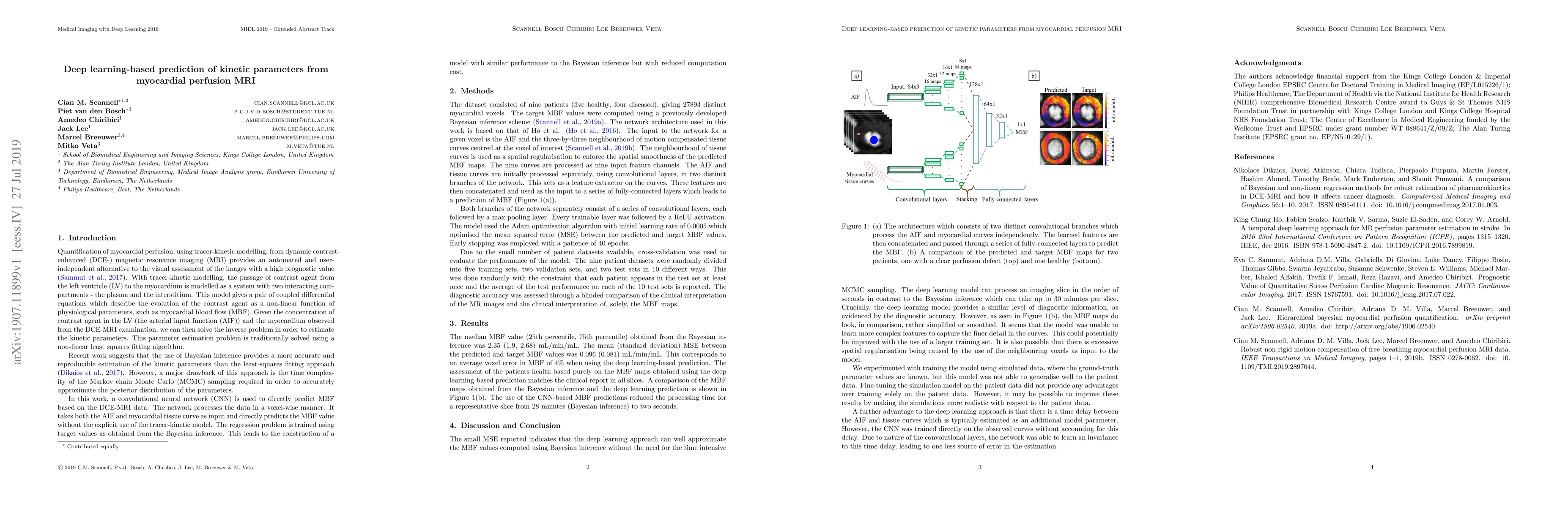 This paper proposes using convolutional neural networks to quickly predict kinetic parameters from myocardial perfusion MRI, improving on traditional Bayesian inference methods that are computationally intensive. The trained networks achieve similar accuracy to Bayesian inference but with significantly faster processing times.