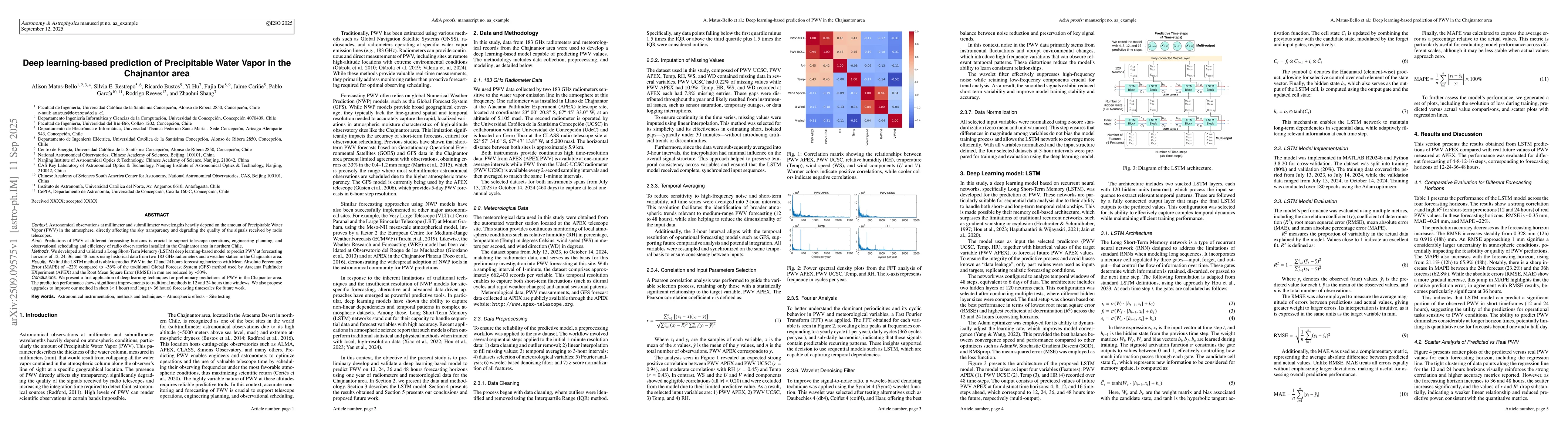 Astronomical observations at millimeter and submillimeter wavelengths heavily depend on the amount of Precipitable Water Vapor (PWV) in the atmosphere, directly affecting the sky transparency and degrading the quality of the signals received by radio telescopes. Predictions of PWV at different forecasting horizons is crucial to support telescope operations, engineering planning, and observational scheduling and efficiency of radio observatories installed in the Chajnantor area in northern Chile. We developed and validated a Long Short-Term Memory (LSTM) deep learning-based model to predict PWV at forecasting horizons of 12, 24, 36, and 48 hours using historical data from two 183 GHz radiometers and a weather station in the Chajnantor area. We find the LSTM method is able to predict PWV in the 12 and 24 hours forecasting horizons with Mean Absolute Percentage Error (MAPE) of 22% compared to 36% of the traditional Global Forecast System (GFS) method used by Atacama Pathfinder EXperiment (APEX) and the Root Mean Square Error (RMSE) in mm are reduced by 50%. We present a first application of deep learning techniques for preliminary predictions of PWV in the Chajnantor area. The prediction performance shows significant improvements to traditional methods in 12 and 24 hours time windows. We also propose upgrades to improve our method in short (< 1 hour) and long (> 36 hours) forecasting timescales for future work.