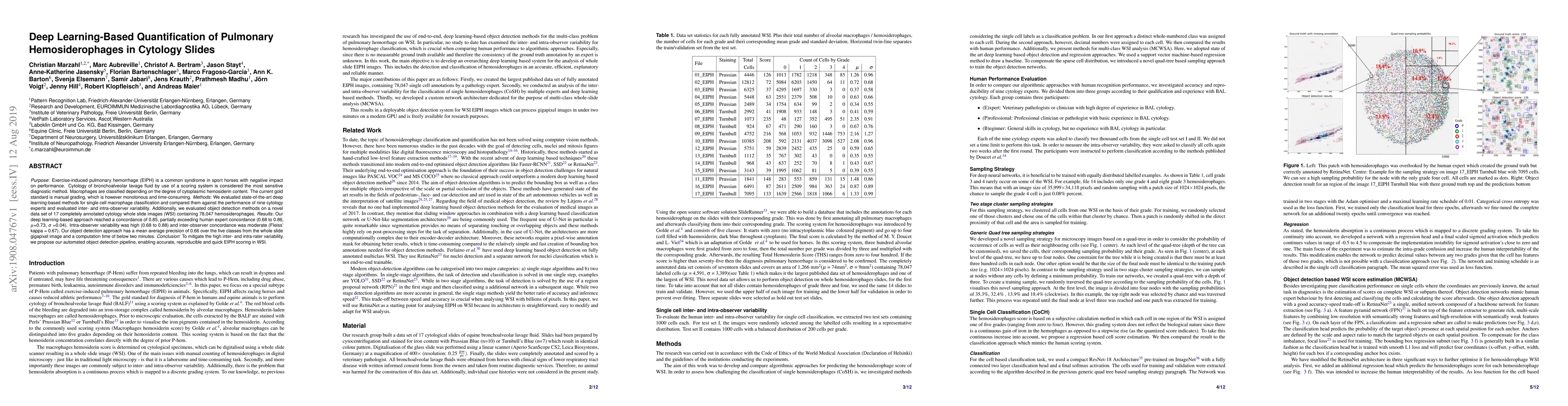 This study evaluates deep learning methods for automated quantification of pulmonary hemosiderophages in bronchoalveolar lavage cytology slides, showing improved accuracy and reproducibility over manual grading by experts. The proposed deep learning approach significantly reduces inter- and intra-observer variability, offering a fast and reliable alternative for diagnosing exercise-induced pulmonary hemorrhage in sport horses.